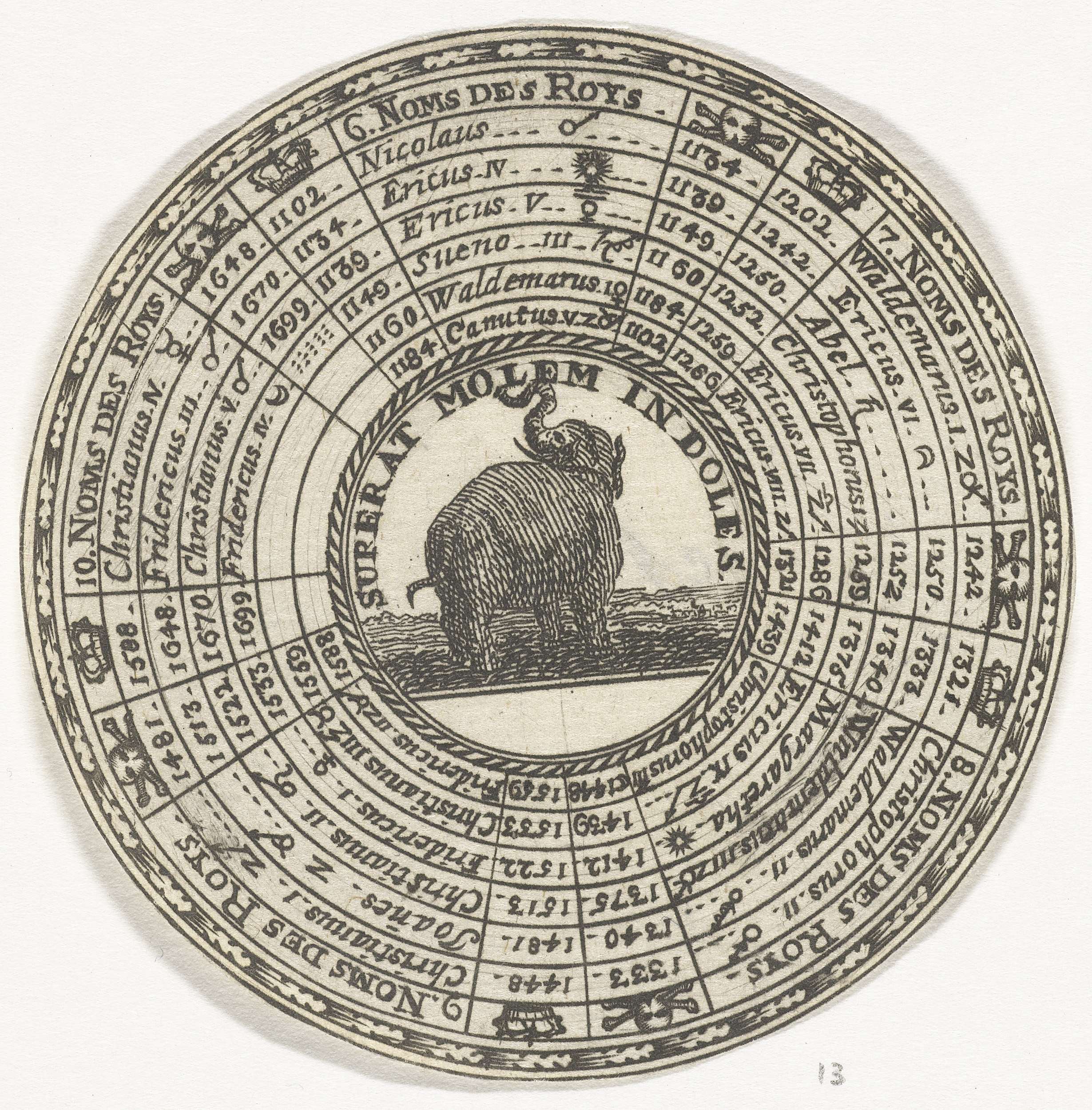 Ontwerp van een ronde penning met, in zeven concentrische cirkels, de namen van Deense koningen en hun regeringsjaren, beginnende bij koning Nicolaas en eindigend bij koning koning Frederik IV. In het midden van de penning een embleem met een olifant en het motto: "Superat Molem Indoles".