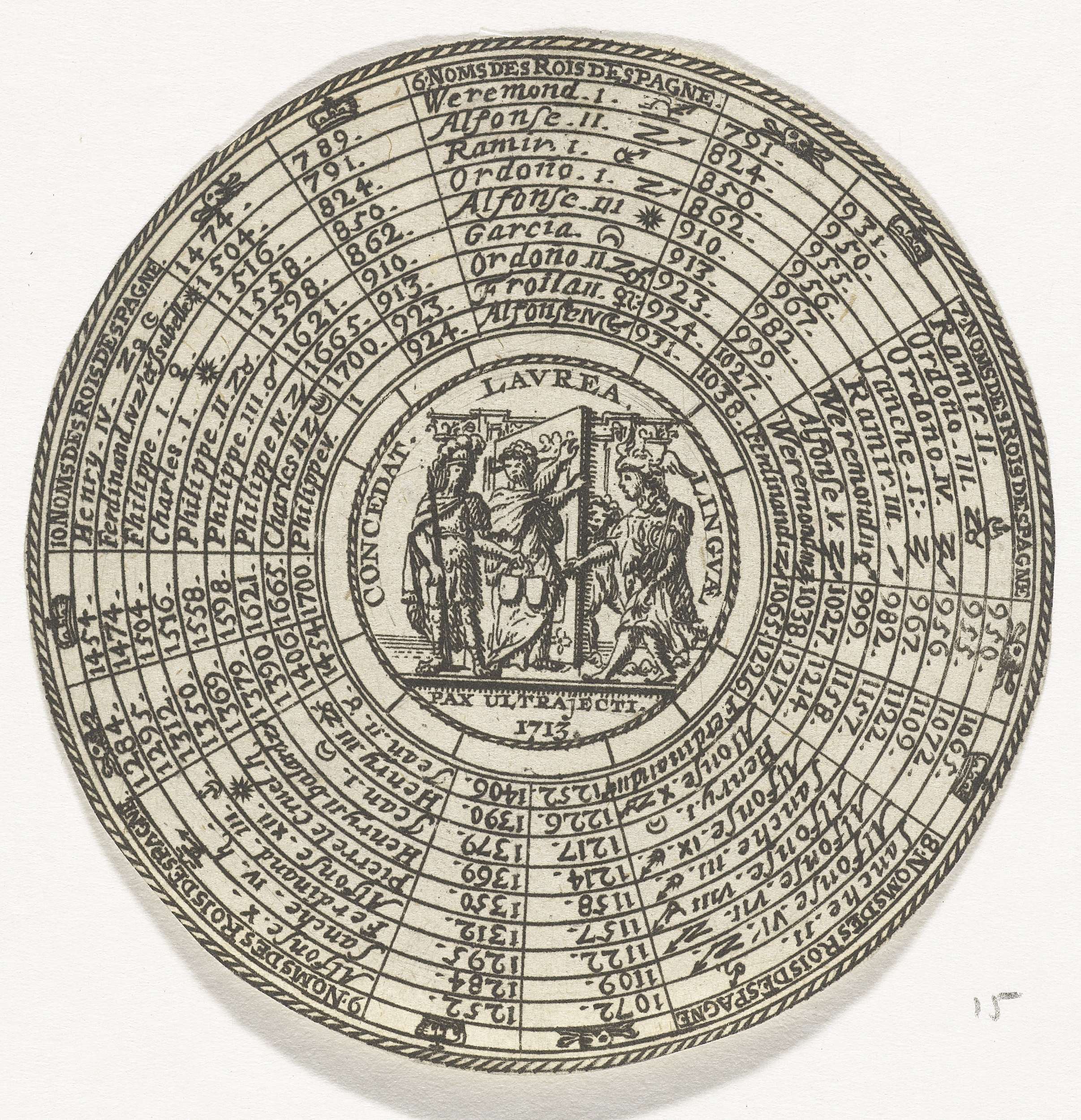 Ontwerp van een ronde penning met, in tien concentrische cirkels, de namen van Spaanse koningen en hun regeringsjaren, beginnende bij koning Bermudo I en eindigend bij koning Filips V. In het midden van de penning een embleem met drie figuren en het motto: "Concedat laurea linguae".