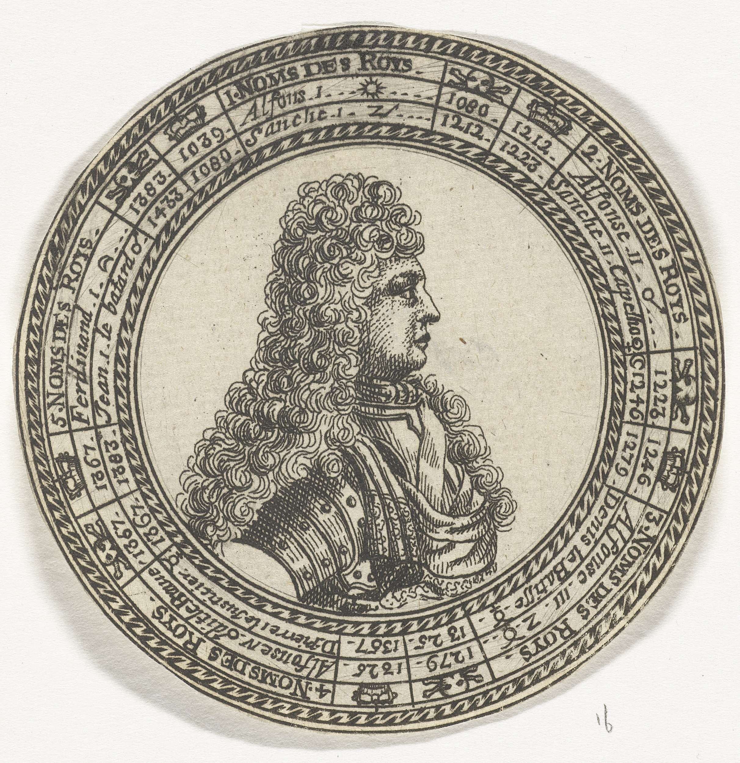 Ontwerp van een ronde penning met, in drie concentrische cirkels, de namen van Portugese koningen en hun regeringsjaren, beginnende bij koning Alfons I en eindigend bij koning Johan I. In het midden van de penning het portret van Johan V.
