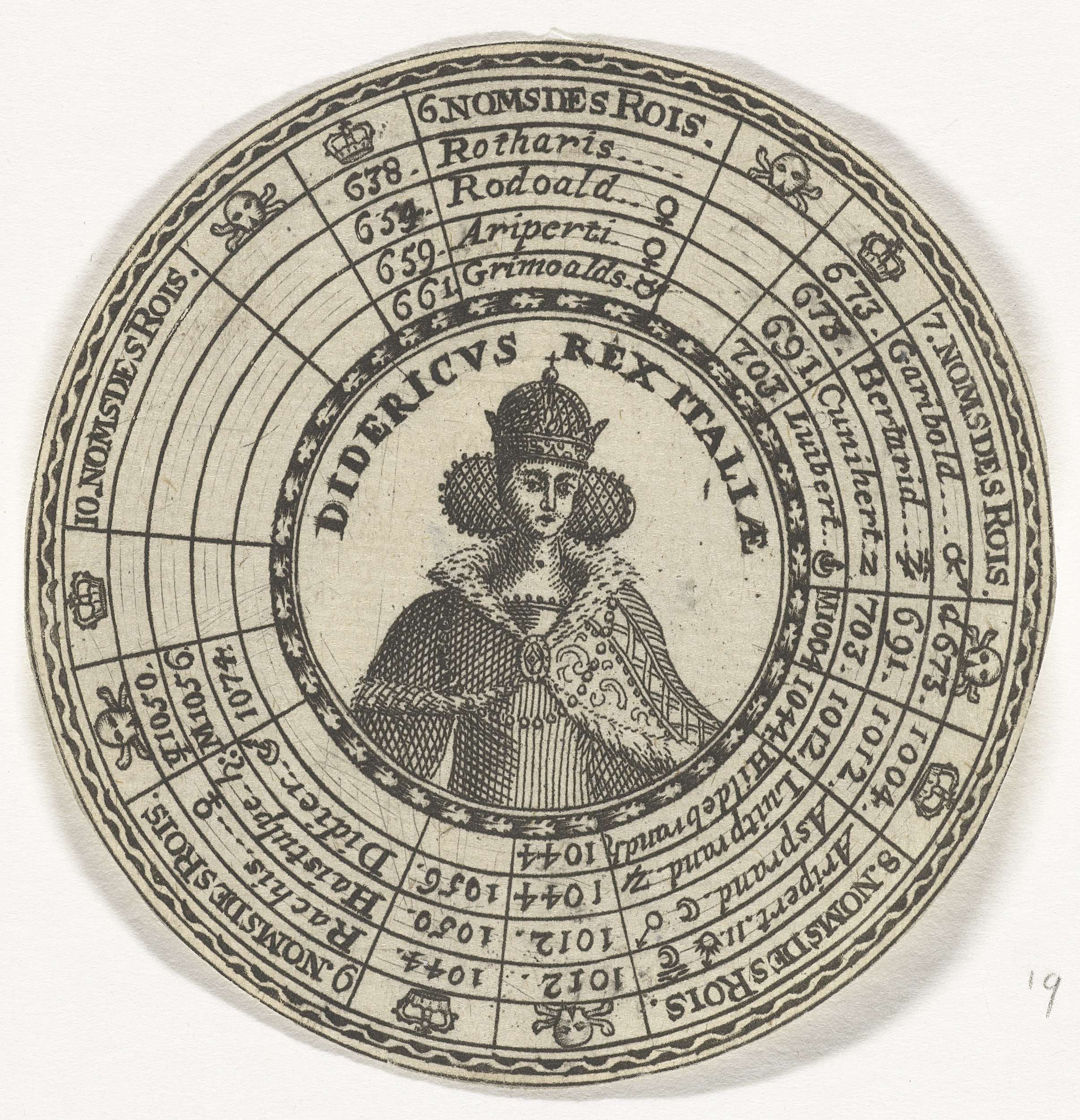 Ontwerp van een ronde penning met, in vijf concentrische cirkels, de namen van Italiaanse koningen en hun regeringsjaren, beginnende bij koning Rothari en eindigend bij koning Diederik. In het midden van de penning het portret van koning Diederik van Italië.