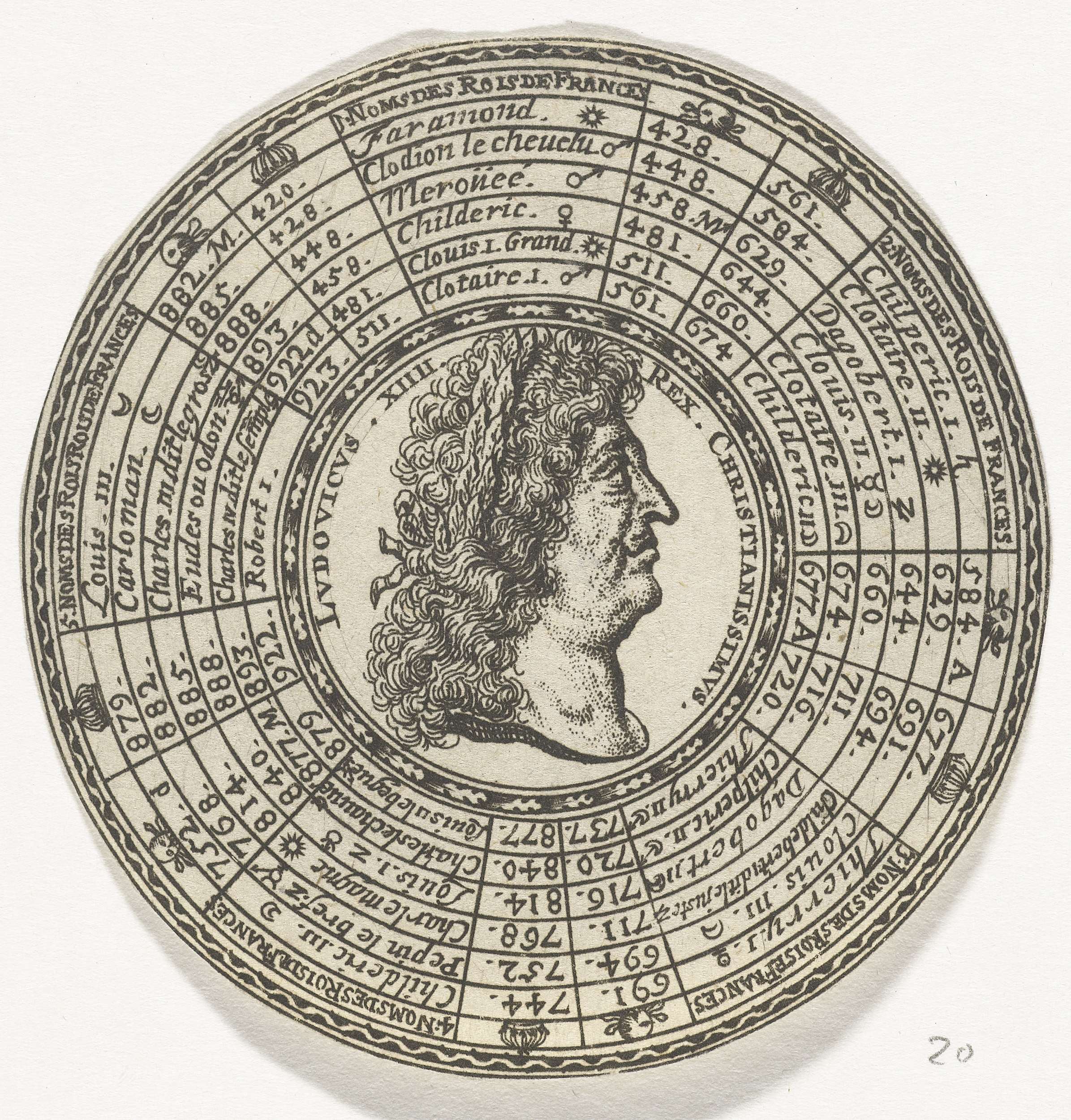 Ontwerp van een ronde penning met, in zeven concentrische cirkels, de namen van Franse koningen en hun regeringsjaren, beginnende bij koning Pharamond en eindigend bij koning Robert I. In het midden van de penning het portret van Lodewijk XIV.