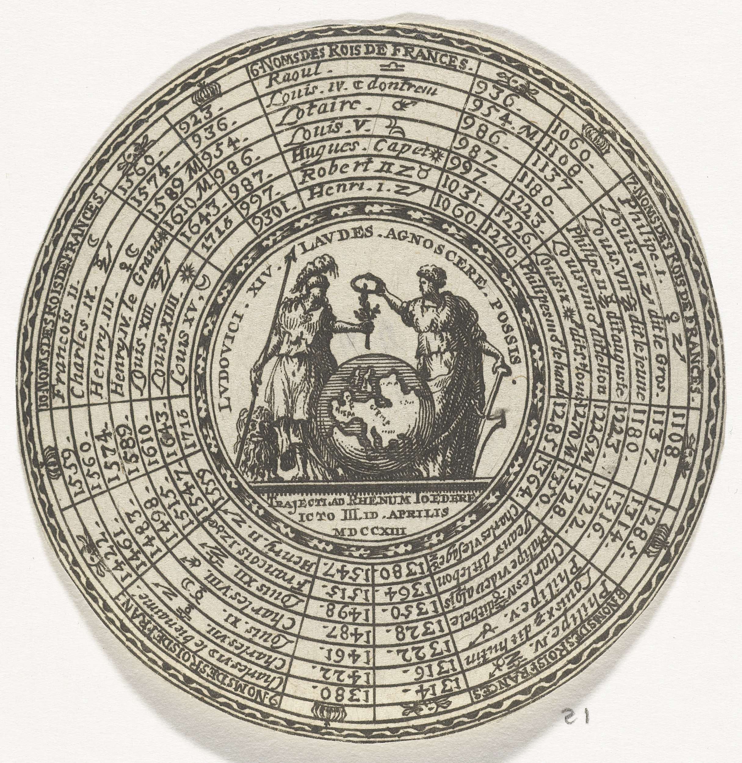Ontwerp van een ronde penning met, in acht concentrische cirkels, de namen van Franse koningen en hun regeringsjaren, beginnende bij koning Rudolf I en eindigend bij koning Lodewijk XV. In het midden van de penning een embleem met Ceres en Minerva, die de wereldbol met een lauwerkrans kronen. Het motto leest: "Laudes agnoscere possis".