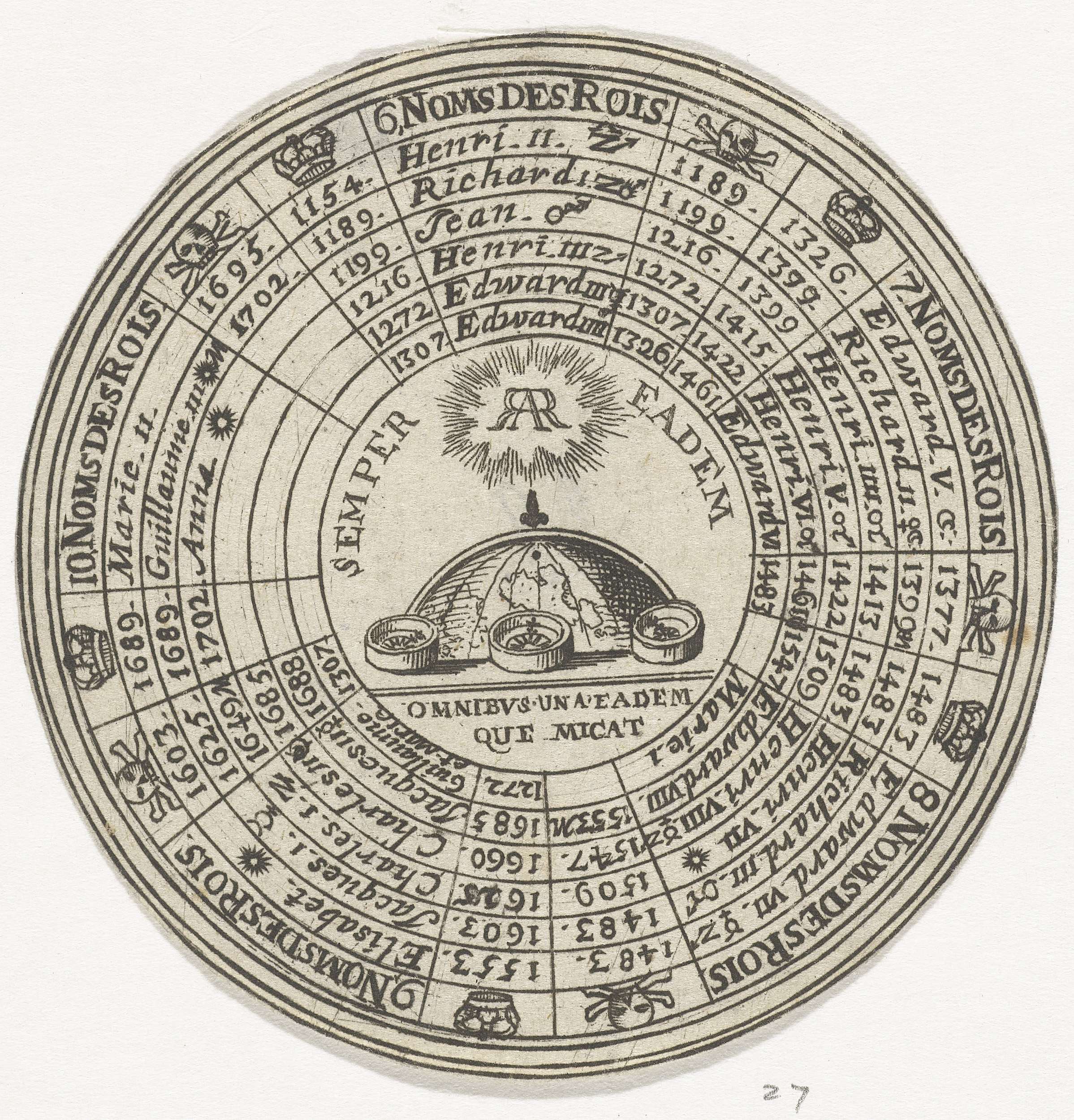 Ontwerp van een ronde penning met, in zeven concentrische cirkels, de namen van Engelse koningen en hun regeringsjaren, beginnende bij koning Hendrik II en eindigend bij koningin Anna Stuart. In het midden van de penning een embleem met een wereldbol en drie kompassen. Het motto van het embleem luidt: "Semper Eadem".