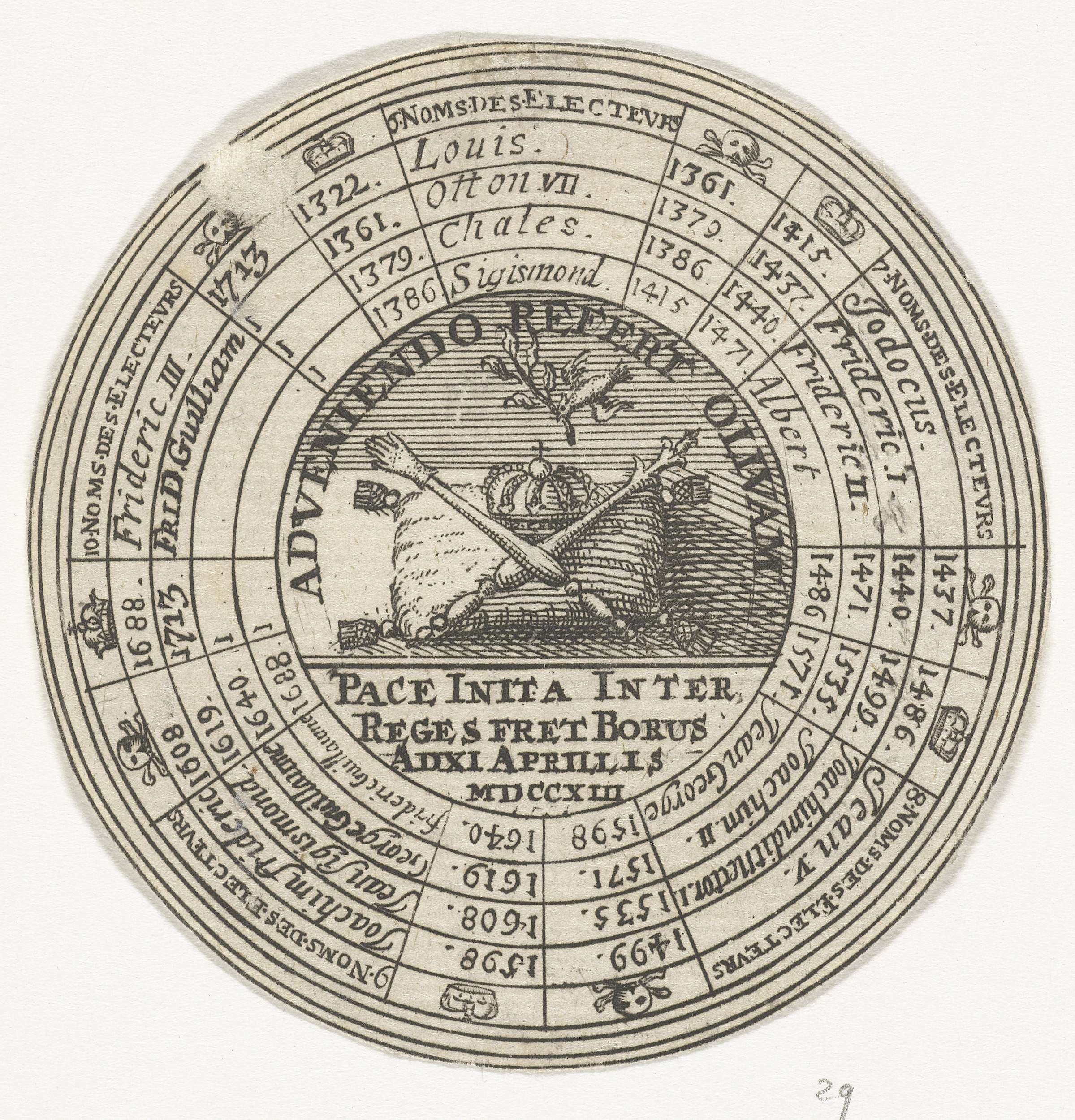 Ontwerp van een ronde penning met, in vijf concentrische cirkels, de namen van de keurvorsten van Brandenburg en hun regeringsjaren, beginnende bij Lodewijk I van Brandenburg en eindigend bij Frederik Willem I. In het midden van de penning een embleem: op een kussen liggen de regalia kroon en scepter. Daarboven een duif een olijftak in ...