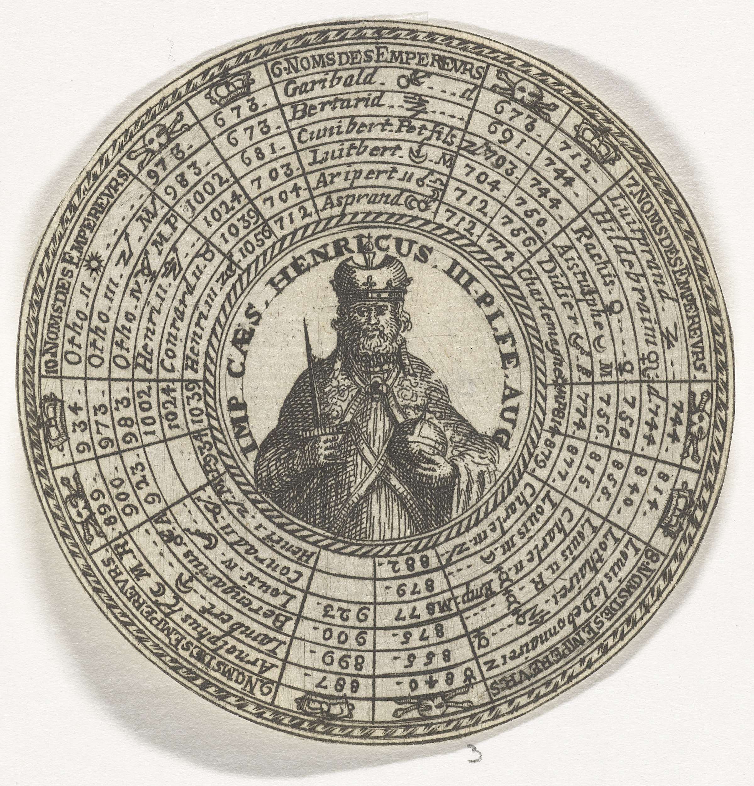 Ontwerp van een ronde penning met, in zeven concentrische cirkels, de namen van keizers en hun regeringsjaren, beginnende bij keizer Garibald (?) en eindigend bij keizer Hendrik III van het Heilig Roomse Rijk . In het midden van de penning het portret van keizer Hendrik III.