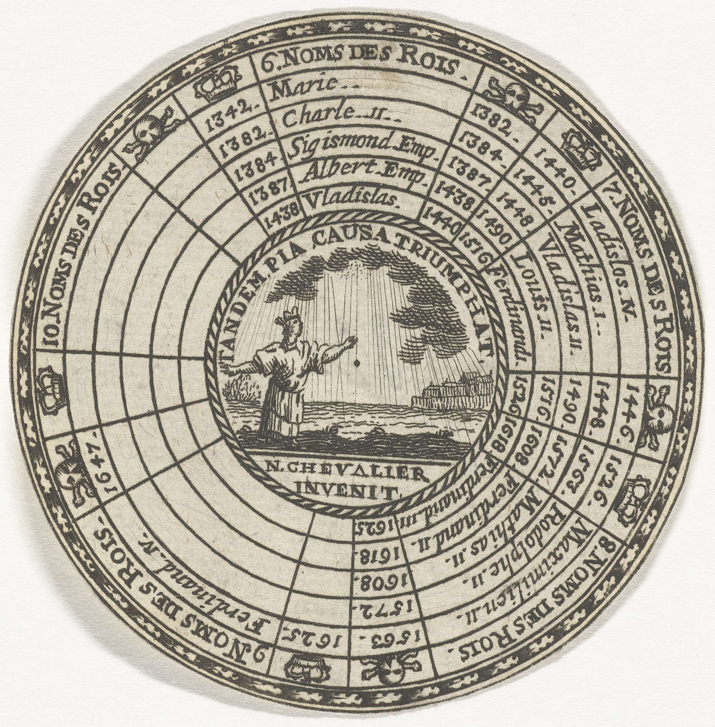 Ontwerp van een ronde penning met, in zes concentrische cirkels, de namen van de koningen van Hongarije en hun regeringsjaren, beginnende bij koningin Maria en eindigend bij Ferdinand IV van Hongarije. In het midden van de penning een embleem met een koning die in regenweer door de zee waadt. Het motto van het embleem luidt: ...