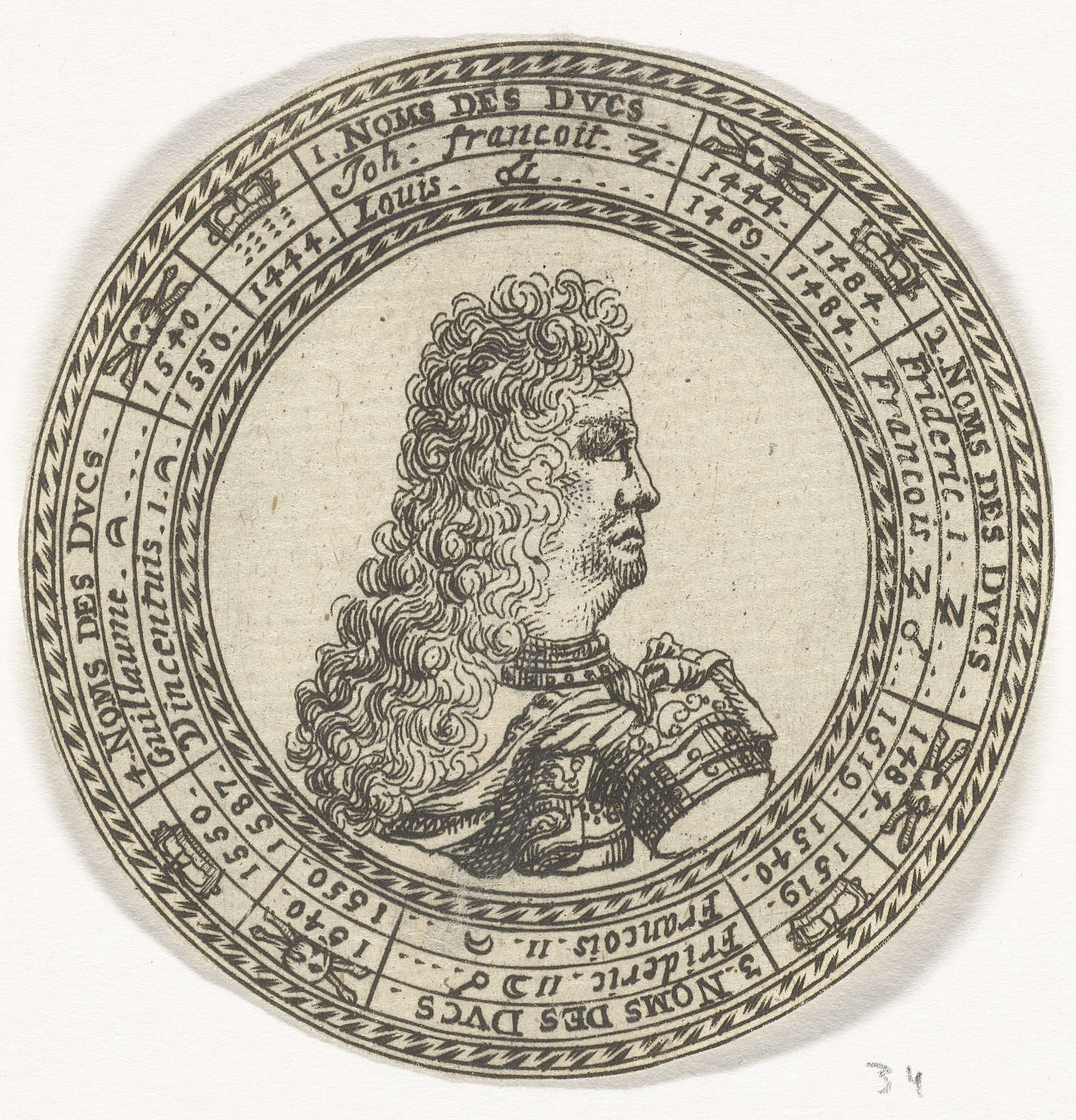 Ontwerp van een ronde penning met, in drie concentrische cirkels, de namen van de hertogen van Mantua en hun regeringsjaren, beginnende bij Gianfrancesco I en eindigend bij hertog Vincenzo I. In het midden van de penning het portret van hertog Ferdinand Karel III.