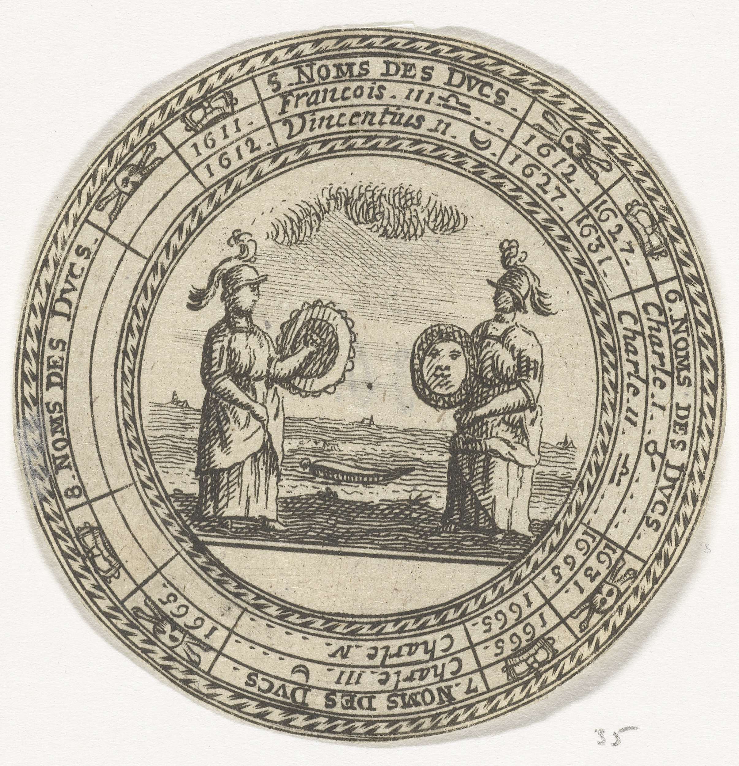 Ontwerp van een ronde penning met, in drie concentrische cirkels, de namen van de hertogen van Mantua en hun regeringsjaren, beginnende bij Francesco IV en eindigend bij hertog Karel III Ferdinand. In het midden van de penning een embleem van twee soldaten met schilden.