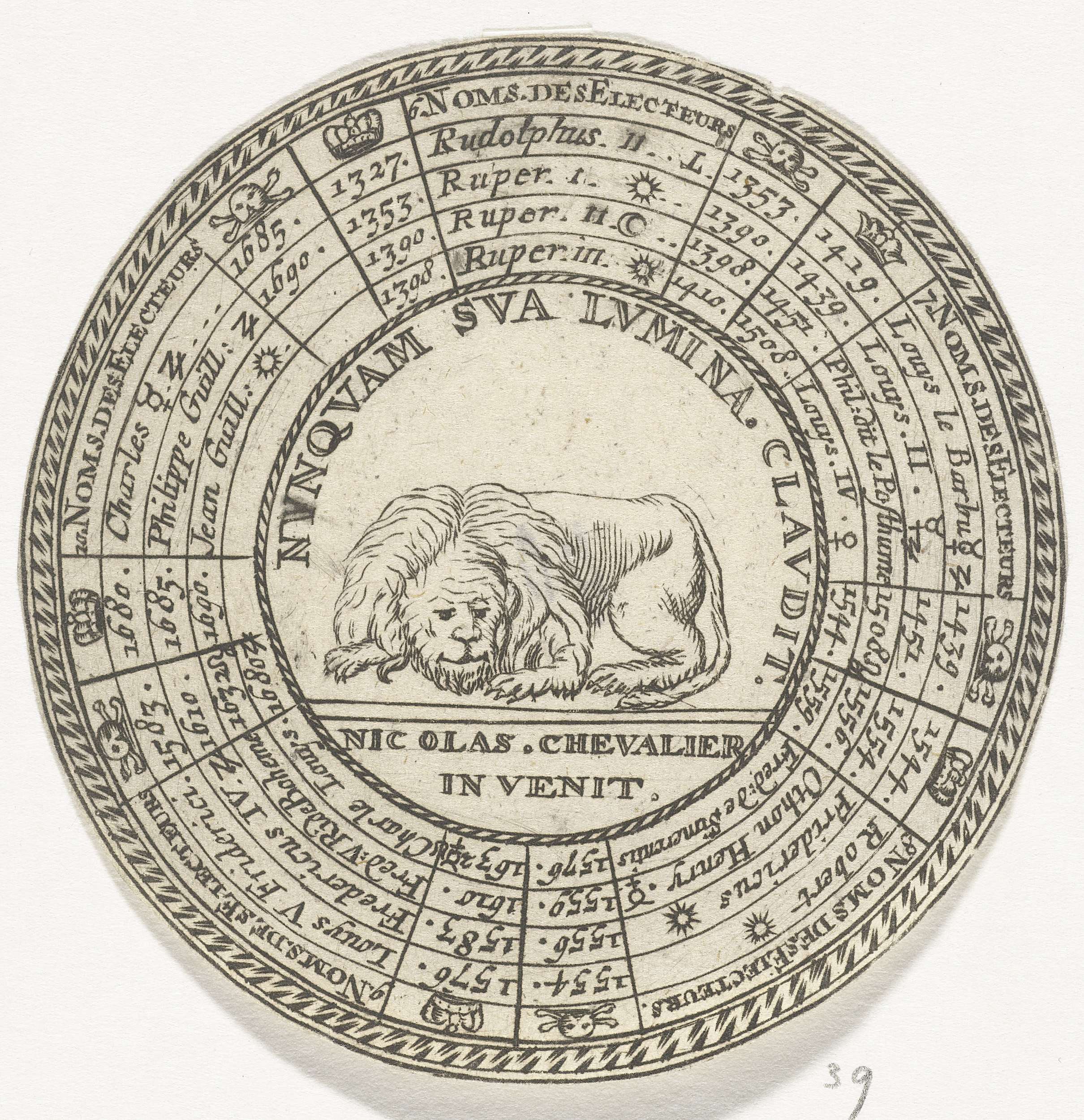 Ontwerp van een ronde penning met, in vijf concentrische cirkels, de namen van de paltsgraven en hun regeringsjaren, beginnende bij Rudolf II en eindigend bij Johan Willem van de Palts. In het midden van de penning een embleem met een leeuw. Het motto van het embleem luidt: "Nunquam sua lumina claudit"