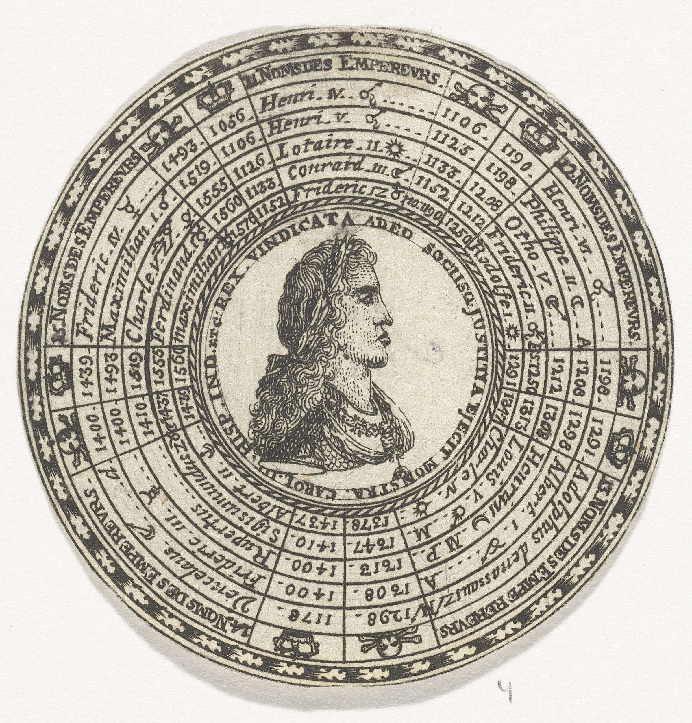 Ontwerp van een ronde penning met, in zes concentrische cirkels, de namen van keizers van het Heilige Roomse Rijk en hun regeringsjaren, beginnende bij keizer Hendrik IV en eindigend bij keizer Maximiliaan II. In het midden van de penning het portret van Karel V.