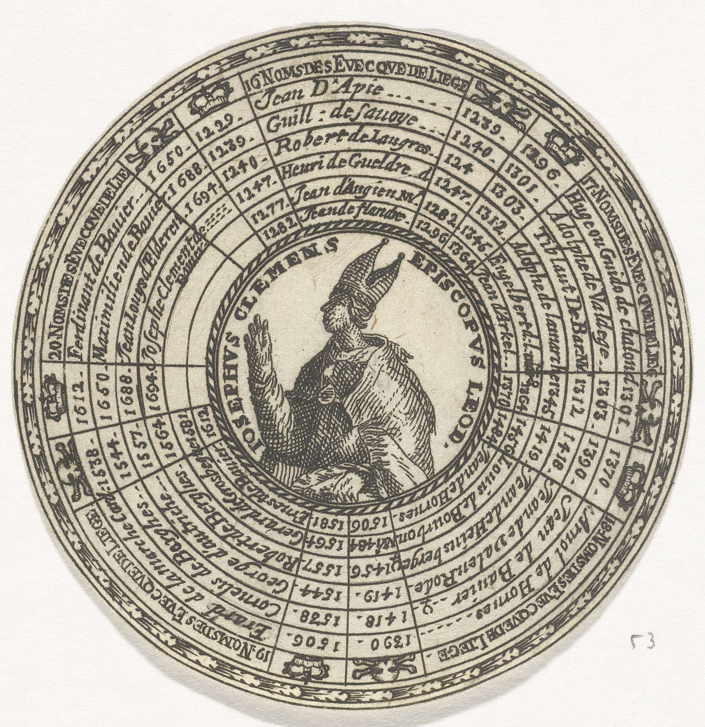 Ontwerp van een ronde penning met, in zeven concentrische cirkels, de namen van de bisschoppen van Luik en hun regeringsjaren, beginnende bij bisschop Johan II en eindigend bij bisschop Jozef Klemens. In het midden van de penning het portret van bisschop Jozef Klemens van Beieren.