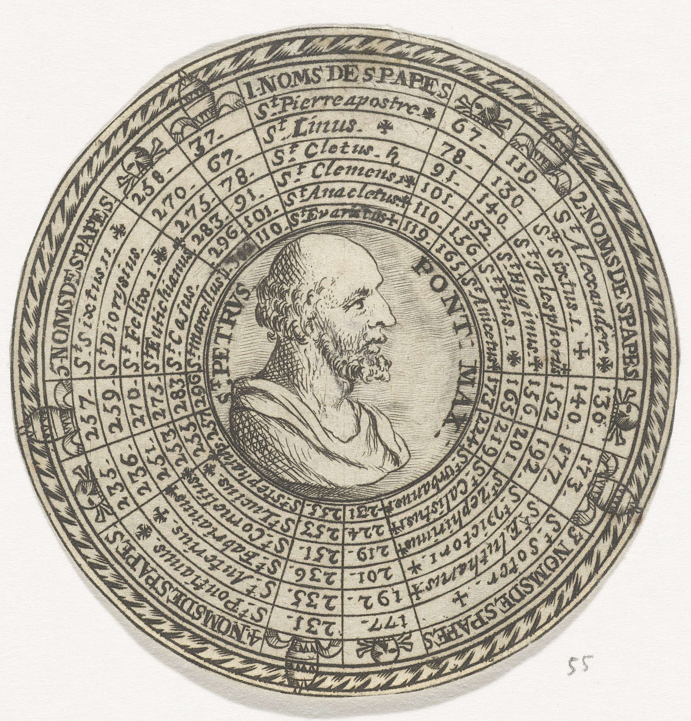 Ontwerp van een ronde penning met, in zeven concentrische cirkels, de namen van de pausen en hun regeringsjaren, beginnende bij apostel Petrus en eindigend bij paus Cajus. In het midden van de penning het portret van de heilige Petrus.