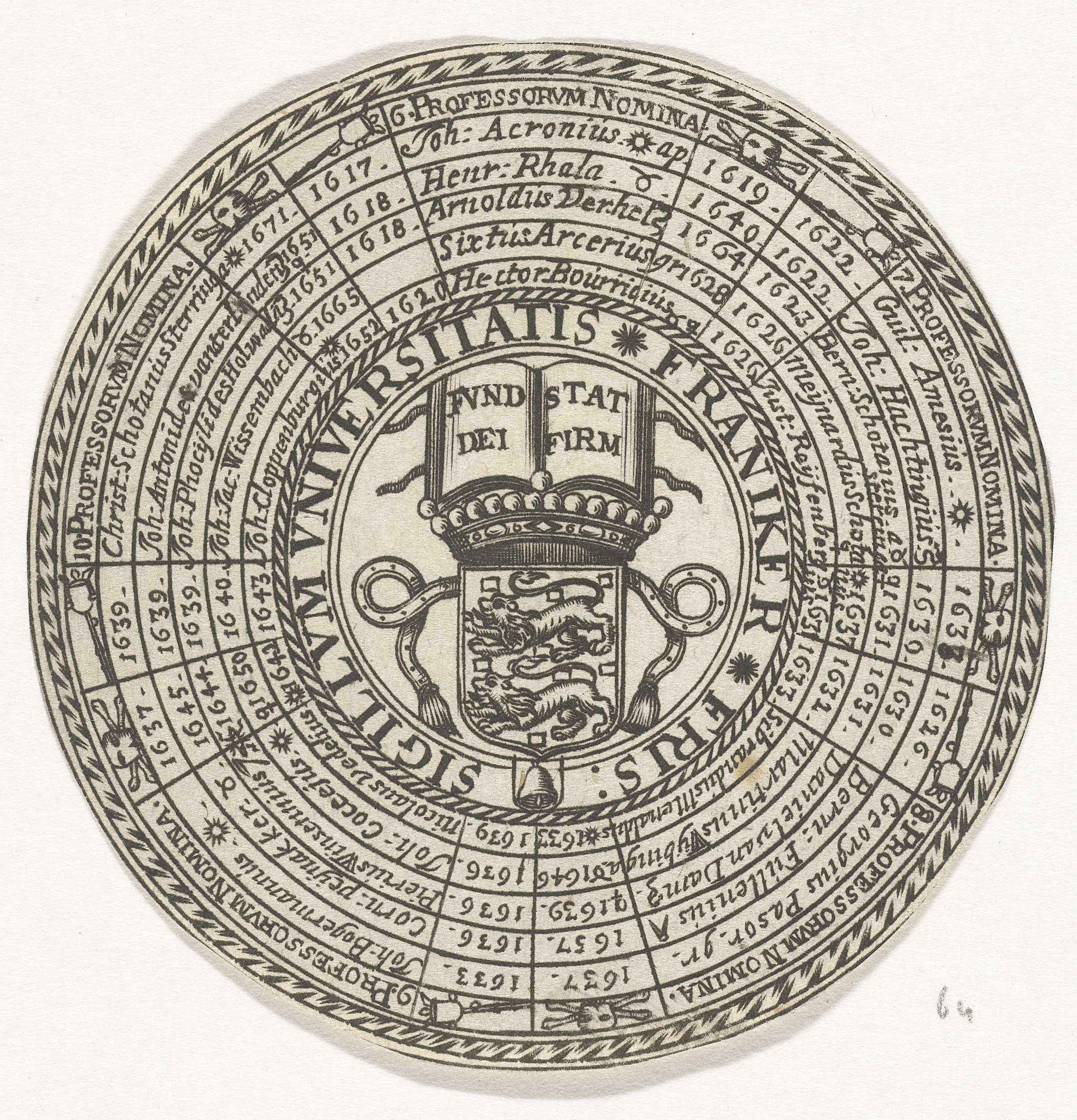 Penning van de Universiteit van Franeker, met de namen van de hoogleraren en het wapen van de universiteit