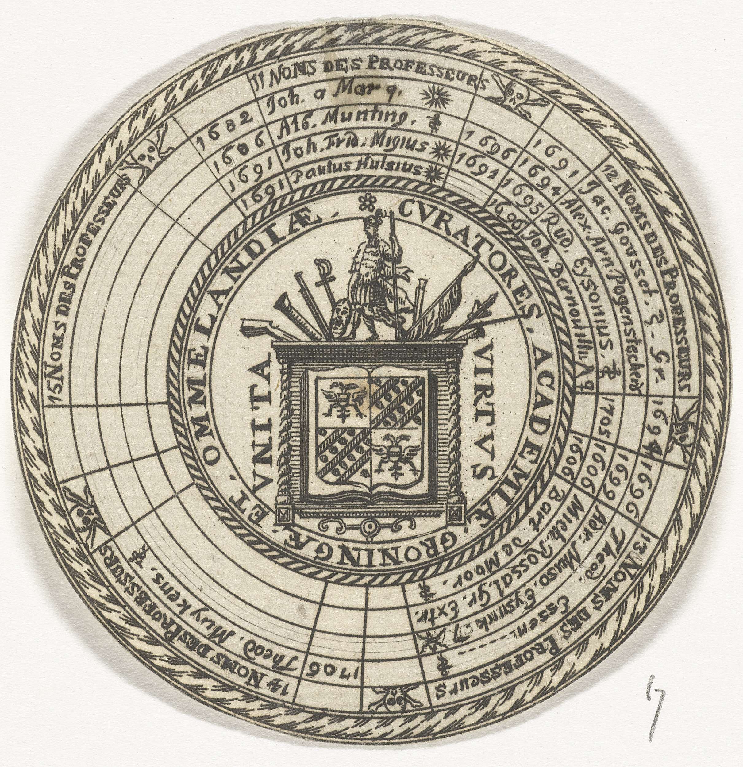Penning van de Universiteit van Groningen, met ruimte voor de namen van de hoogleraren en wapen van de universiteit