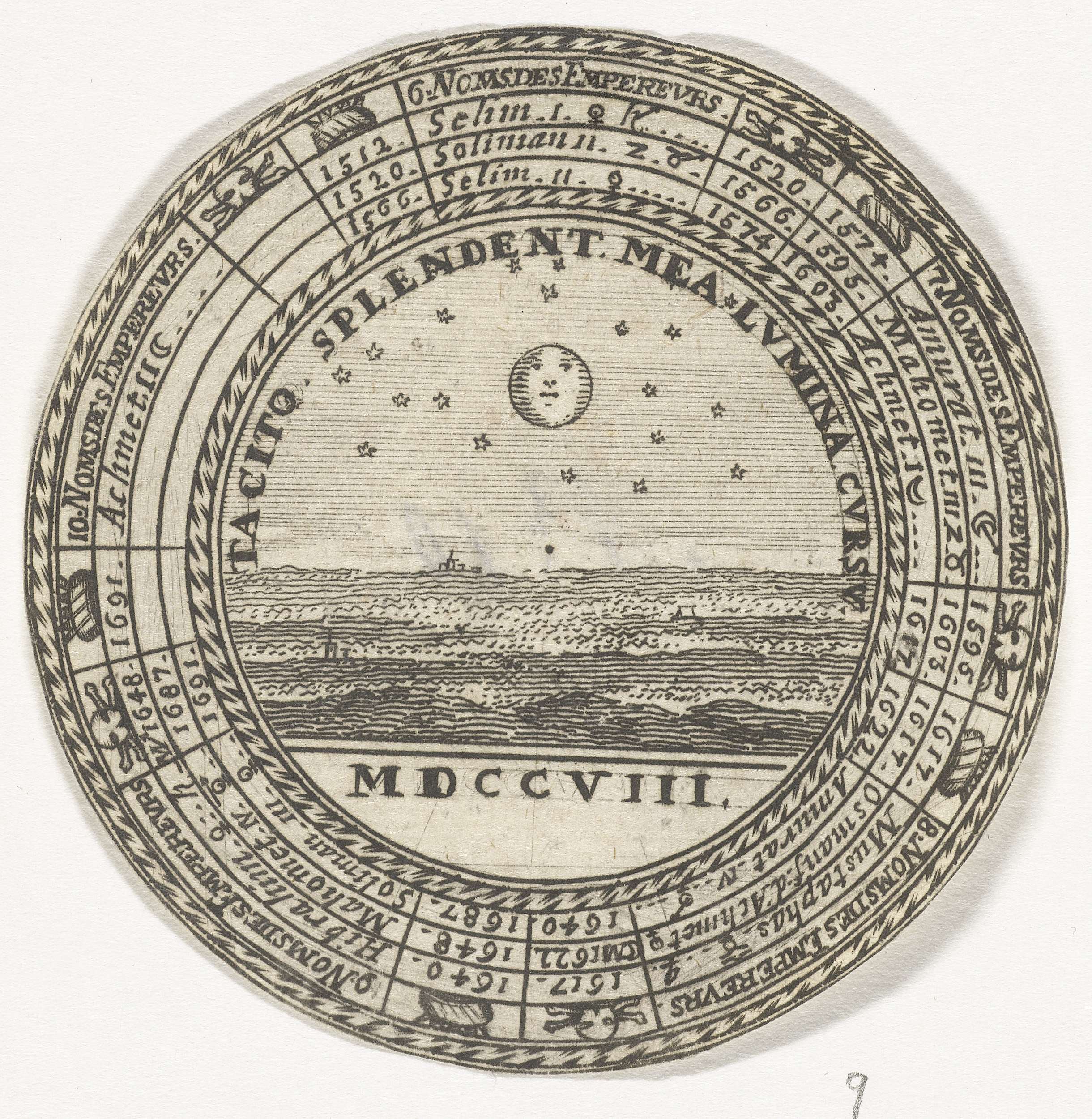 Ontwerp van een ronde penning met, in vier concentrische cirkels, de namen van Ottomaanse sultans en hun regeringsjaren, beginnende bij sultan Selim I en eindigend bij Sultan Ahmed II. In het midden van de penning een embleem met een zeelandschap en het motto: "Tacito Splendent Mea Lumina Cursu".