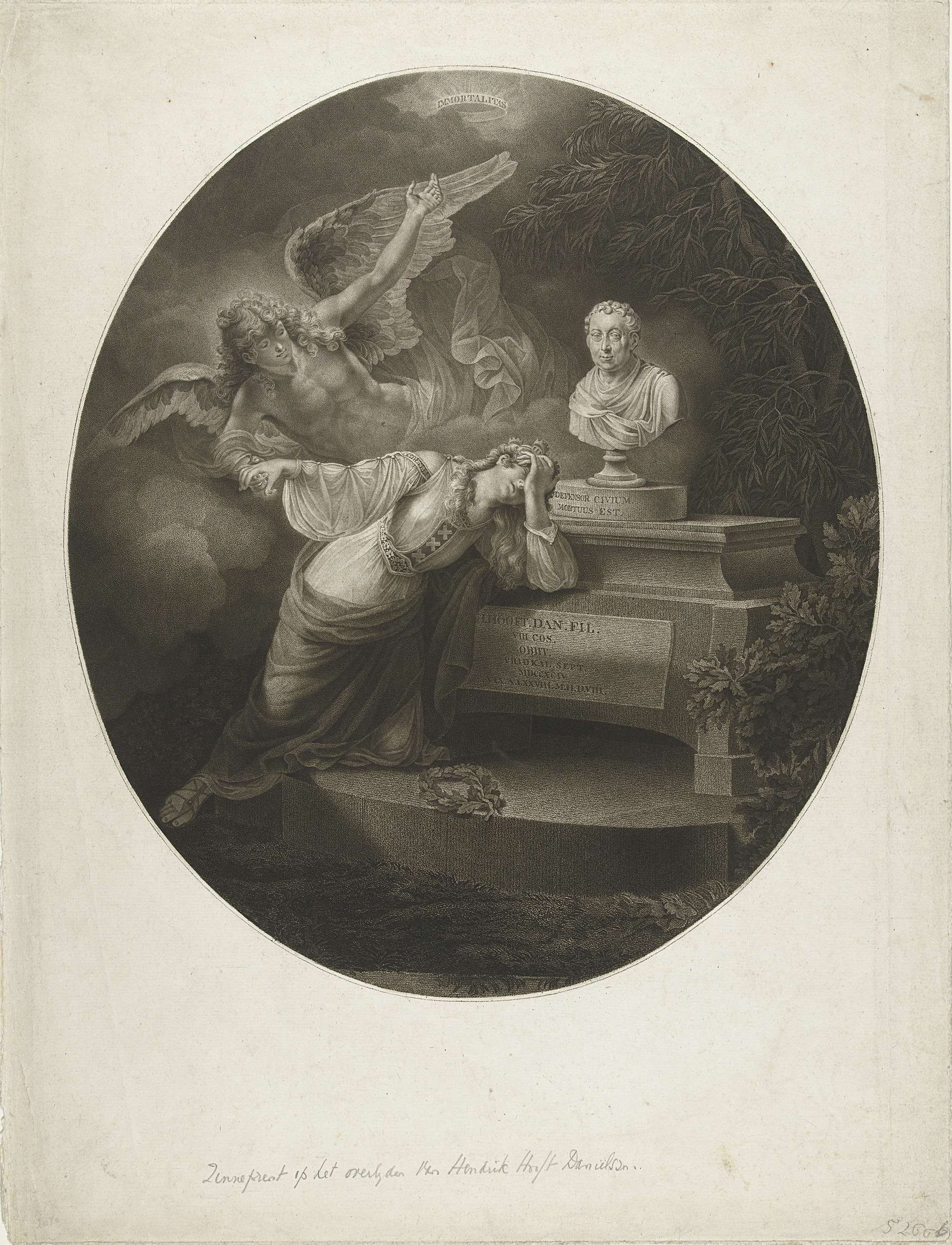 De Amsterdamse stedenmaagd rouwt bij het graf van de Amsterdamse burgermeester Hendrik Hooft Daniëlsz. Een engel steunt haar in het verdriet en wijst haar op de onsterfelijkheid van de overledene. Op de graftombe staat een portretbuste van Hooft Daniëlsz. in antieke stijl.