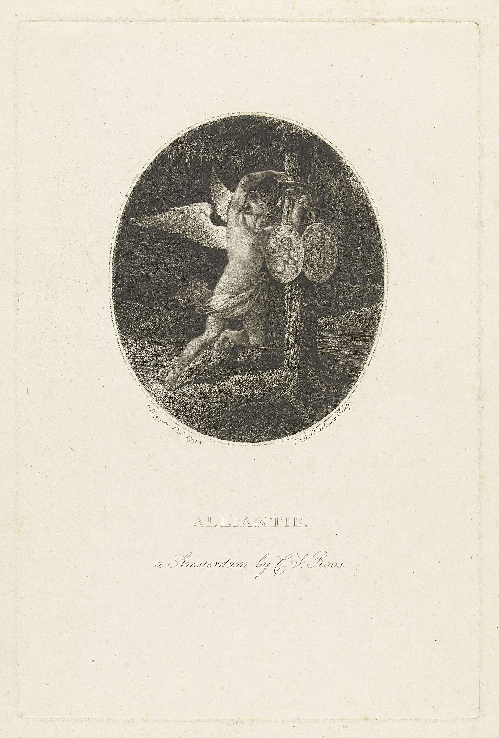Een engel bindt de wapens van de Nederlandse en Franse Republiek samen aan een boom.