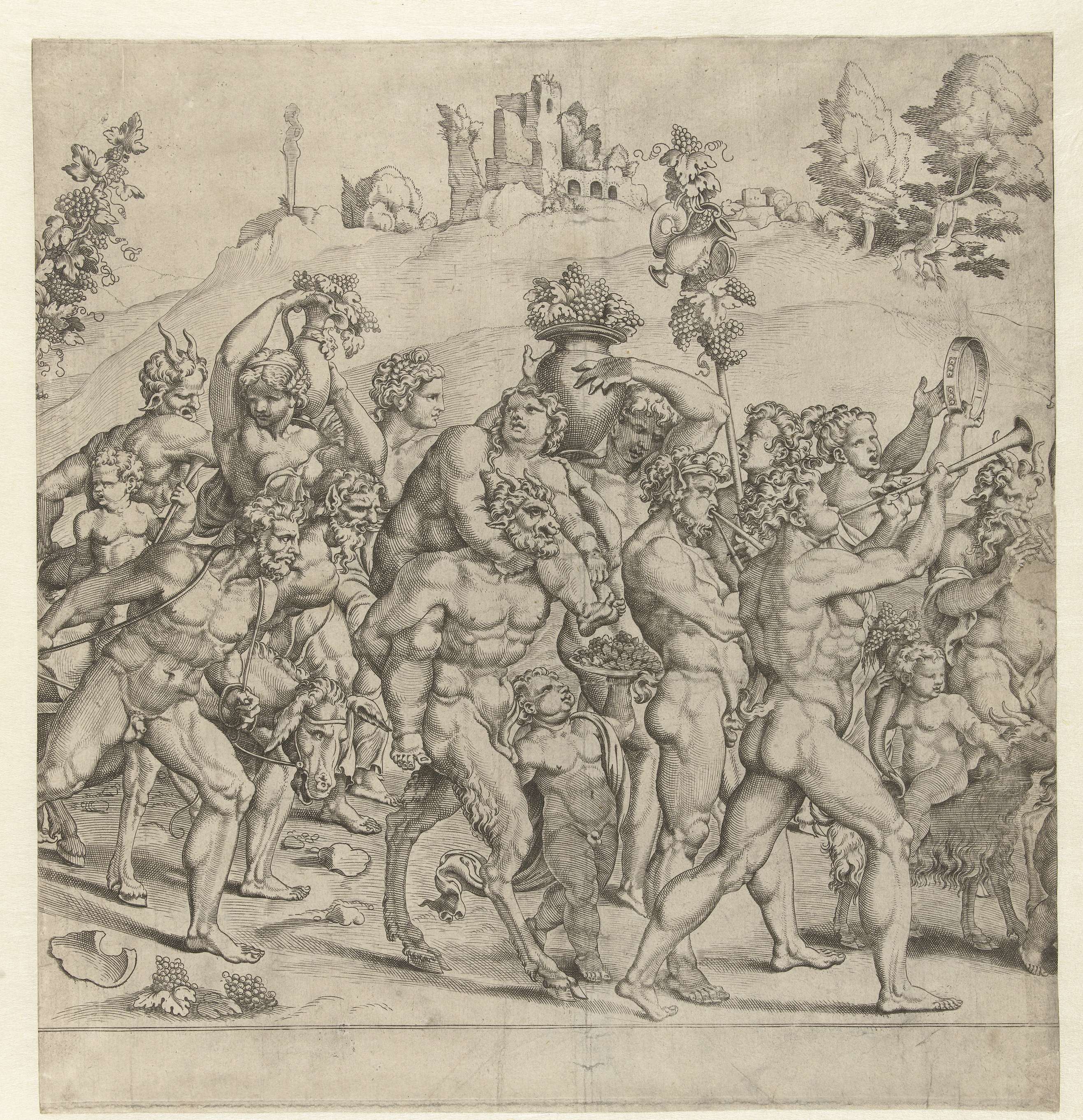 Optocht ter ere van de God Bacchus. In de stoet lopen saters en putti uitgelaten te feesten. Sommigen spelen op fluiten en tamboerijnen. De wagen met Bacchus wordt getrokken door twee mannen en een ezel. Midden deel van een prent bestaande uit drie platen.