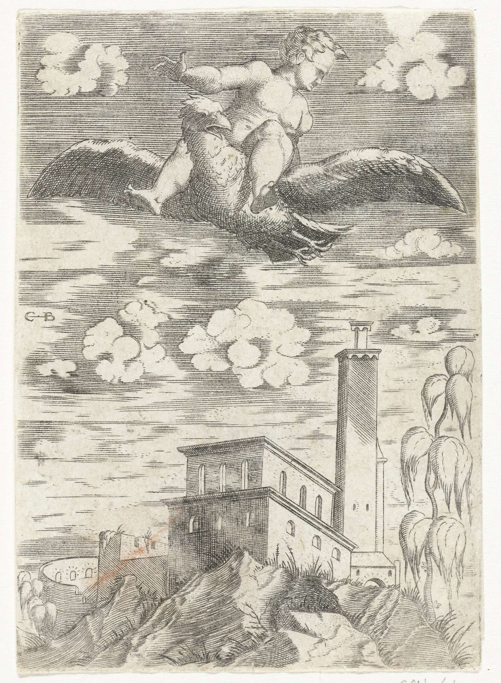 Ganymedes, de zoon van koning Tros, wordt ontvoerd door Jupiter in de gedaante van een adelaar. Onder hen de stad Troje.