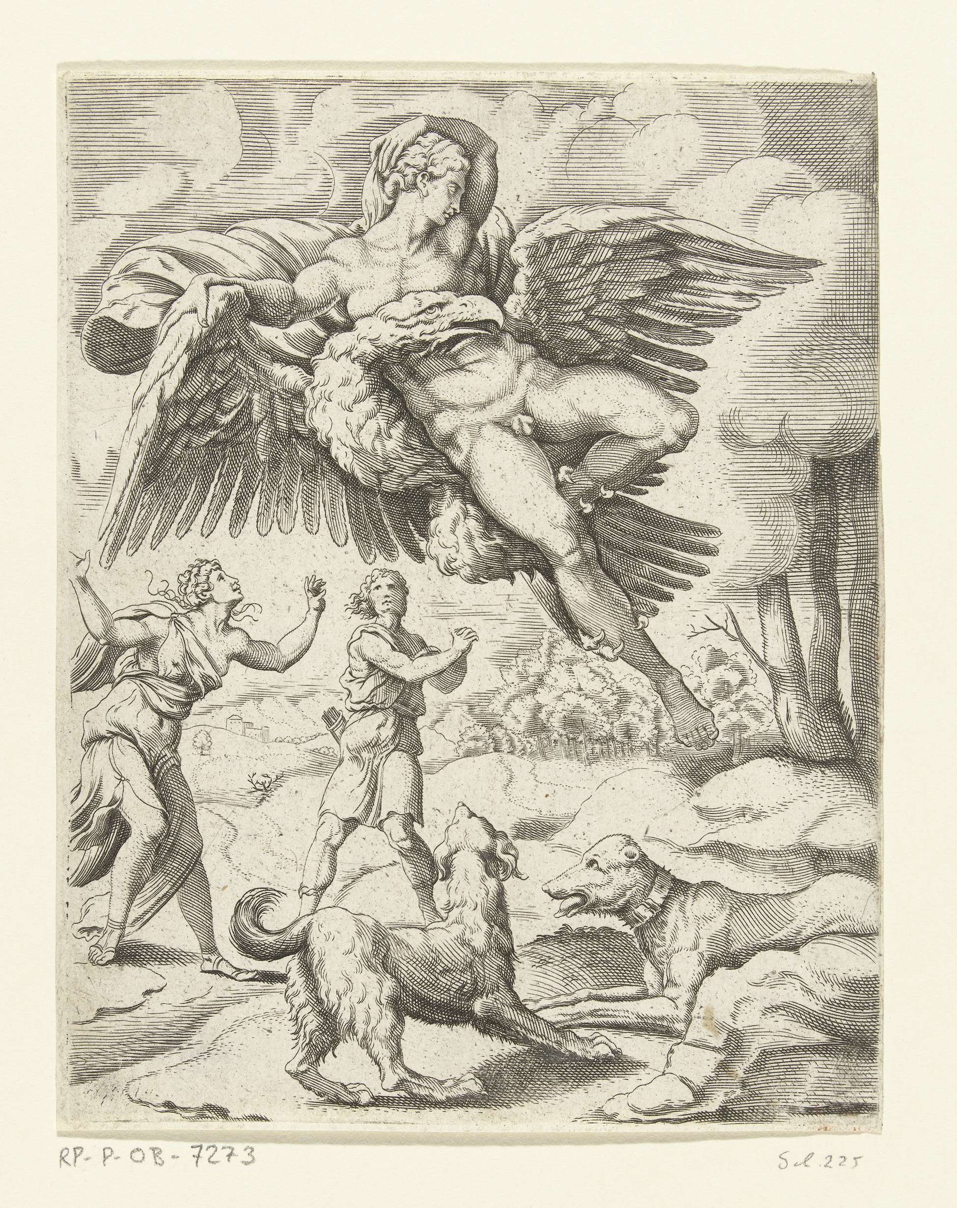 Jupiter, in de gedaante van een adelaar, brengt de mooie Ganymedes naar de Olympus. Ganymedes is naakt en zijn benen worden door de klauwen van de adelaar vastgehouden. Zijn arm leunt op de vleugel van de adelaar. Op de grond kijken een jonge man en een jonge vrouw, en twee honden in paniek naar de ...
