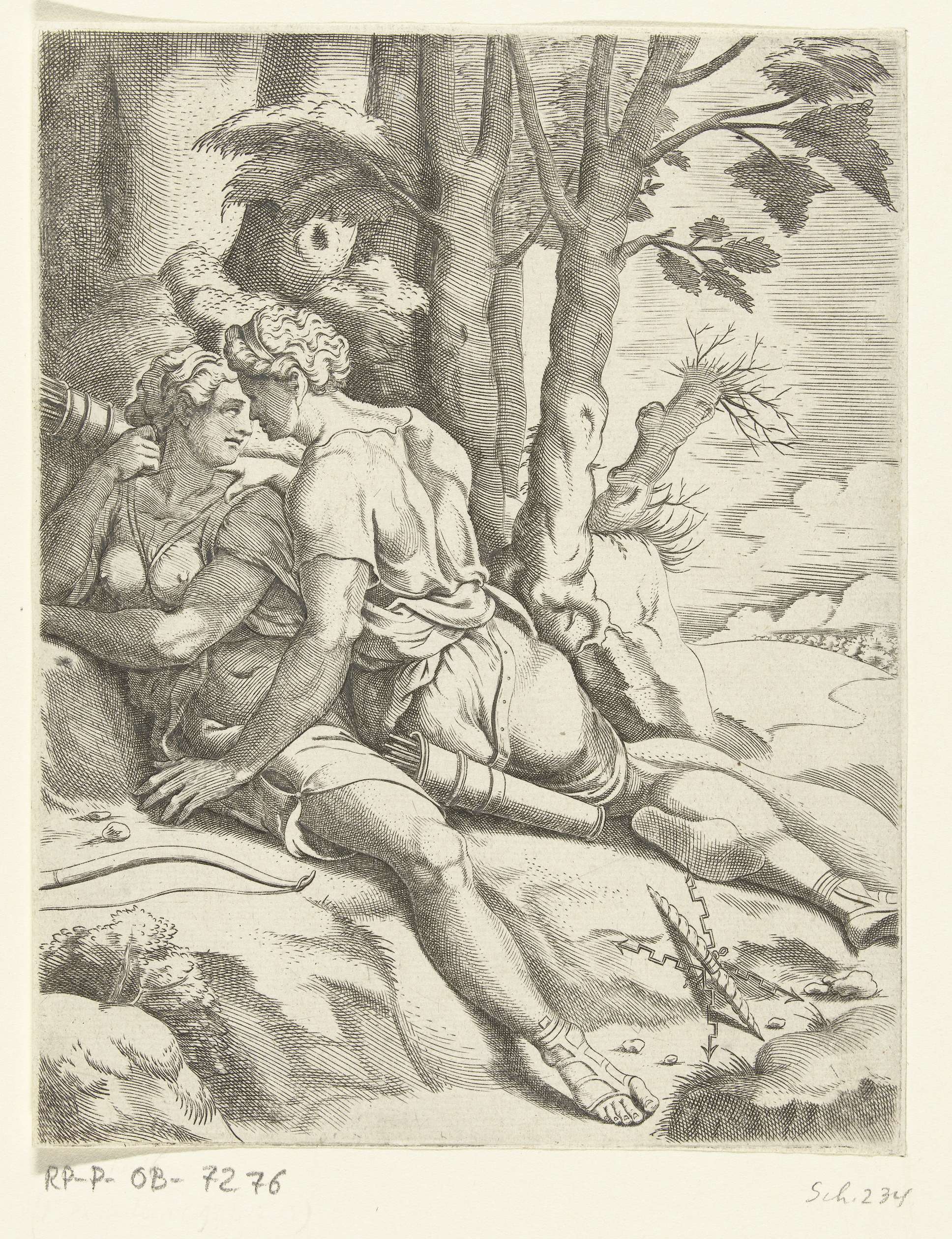 Jupiter benadert de nimf Callisto in de gedaante van de godin Diana. Callisto en Jupiter liggen onder een boom, de bliksemschichten van Jupiter liggen in het gras. Jupiter kijkt verliefd naar Callisto, Callisto kijkt ietwat achterdochtig. Prent uit een serie van 10 prenten die het liefdesleven van Jupiter illustreren.