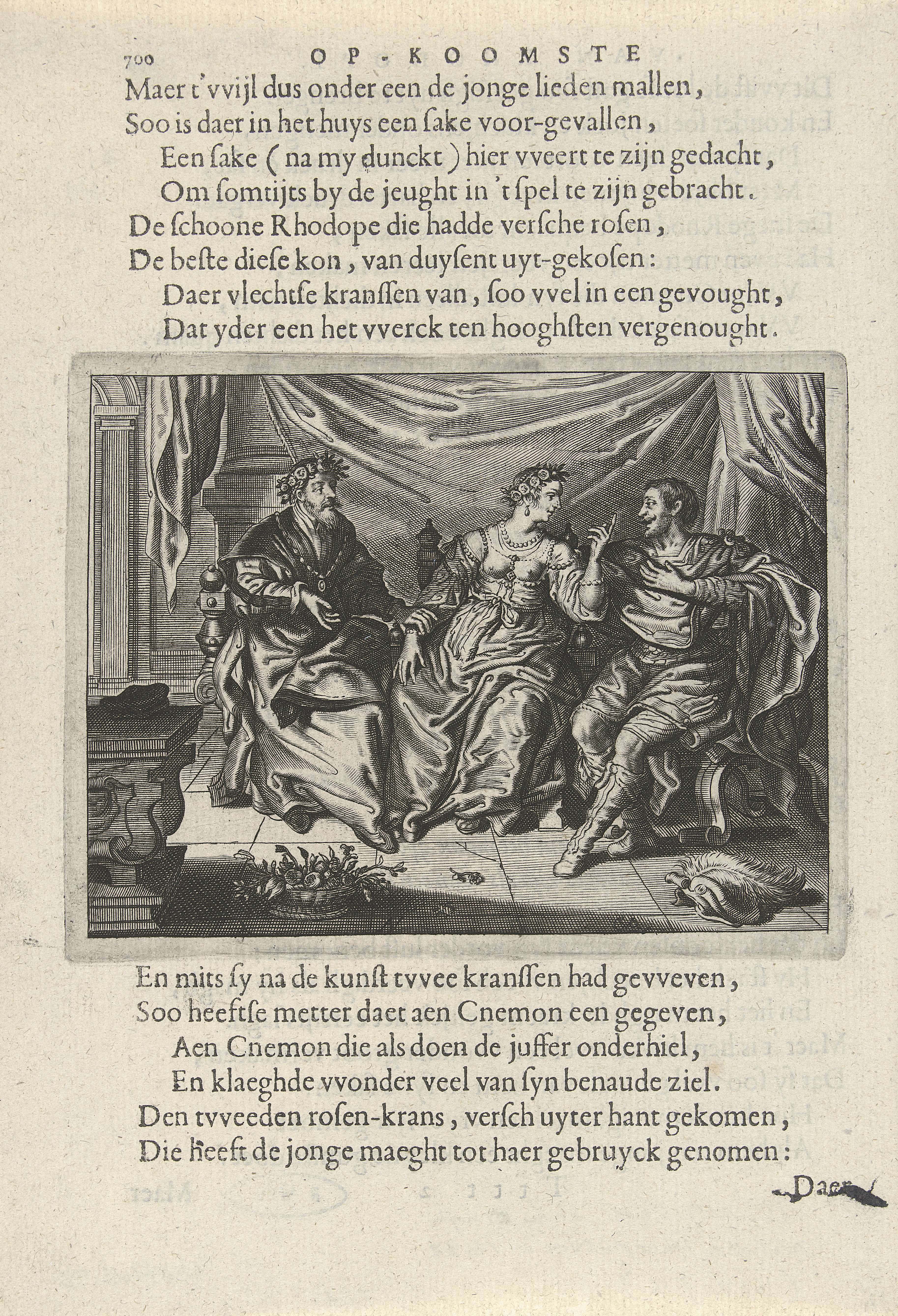 In een koningsvertrek geeft Rhodope de dichter Cnemon een rozenkrans als dank voor zijn mooie gedichten. Bladzijde uit een boek met tekst op recto en verso.