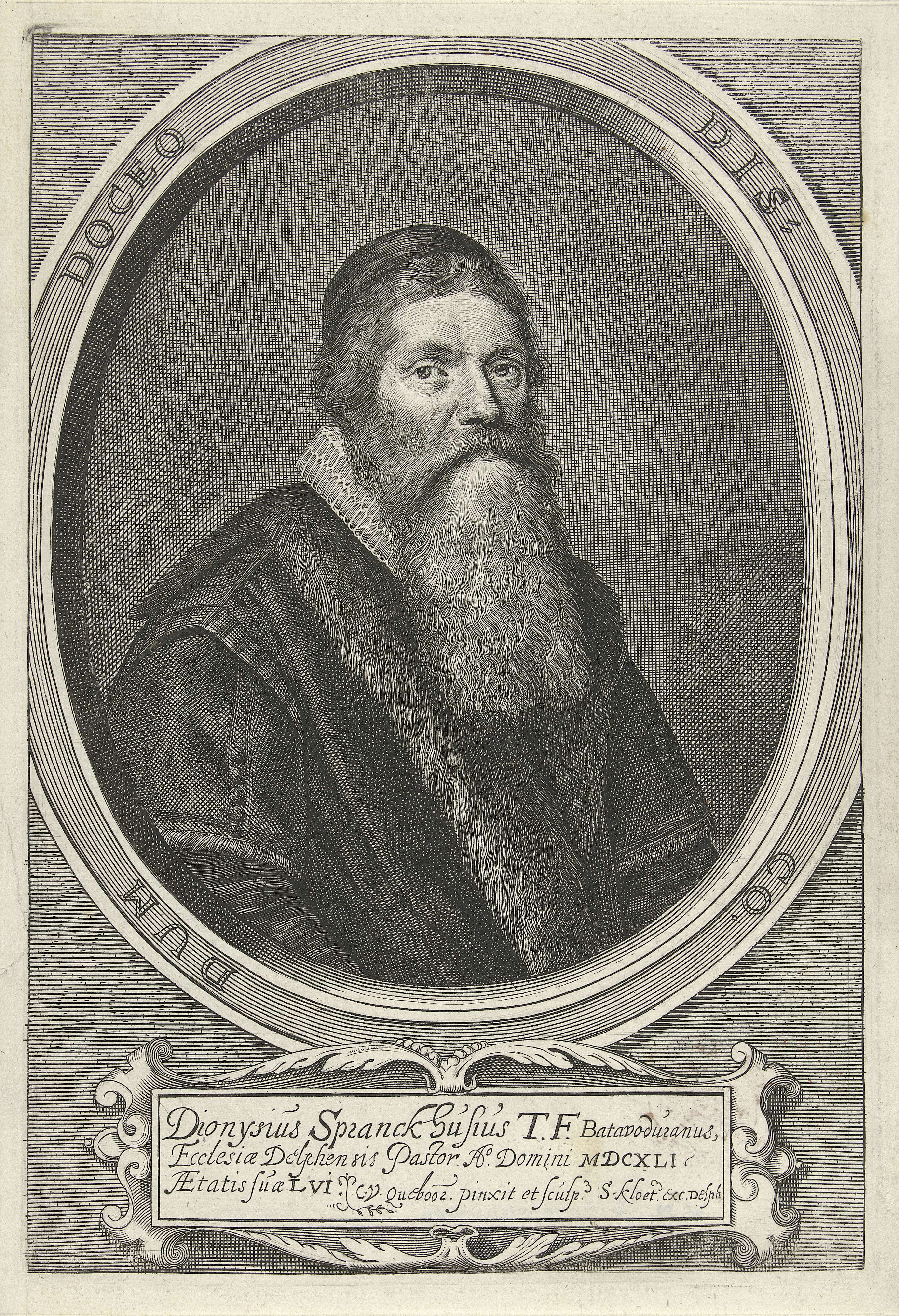 Portret van de predikant Dionysius Spranckhuysen, op 56 jarige leeftijd. Onder het portret een cartouche met zijn naam en titels in het Latijn.