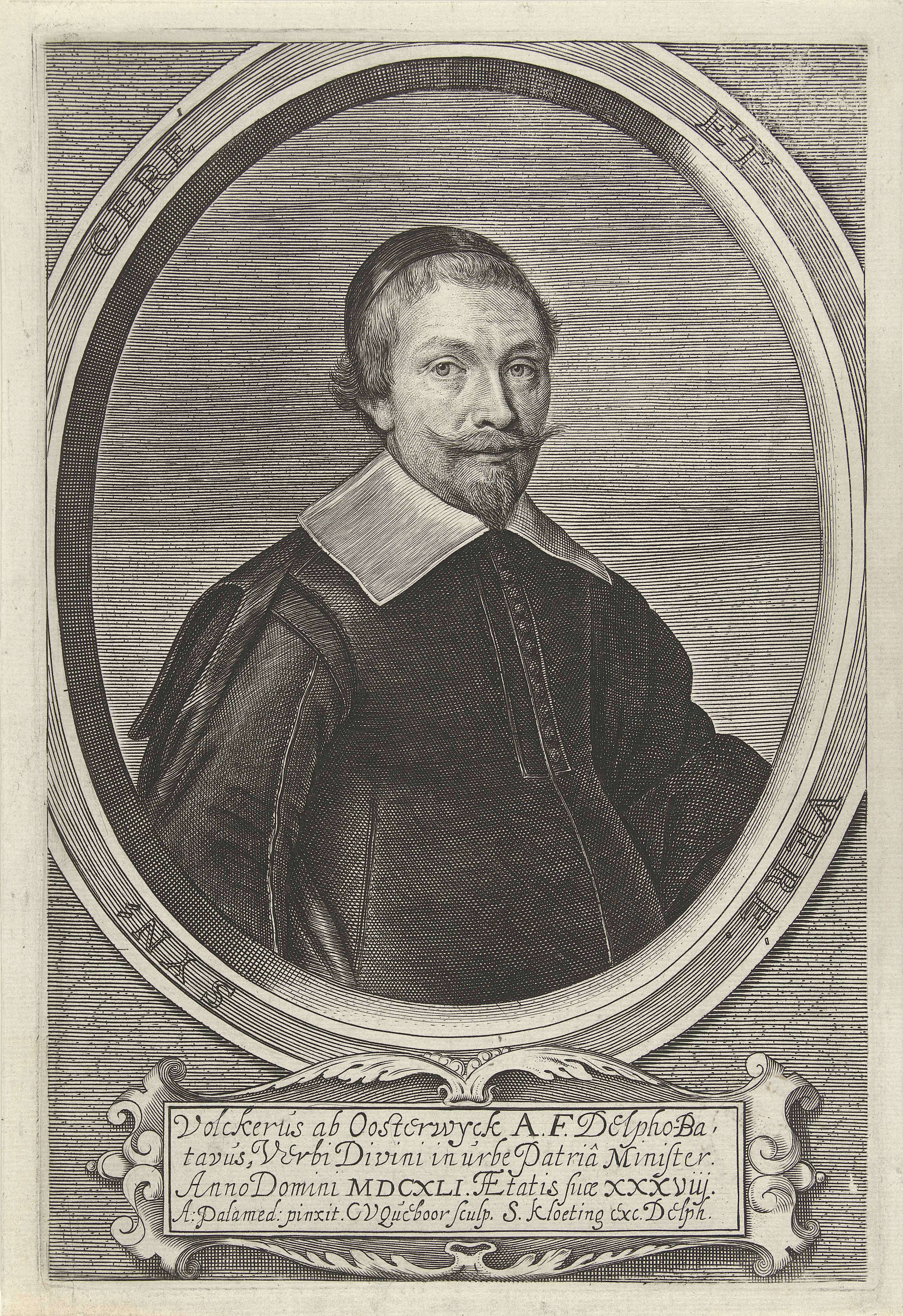 Portret van Volkerus van Oosterwyk, predikant te Delft, Venetië en Rotterdam. Hij is afgebeeld op 38-jarige leeftijd. In de omlijsting zijn zinspreuk: Syncere et vere. In de marge zijn naam en titels in het Latijn.