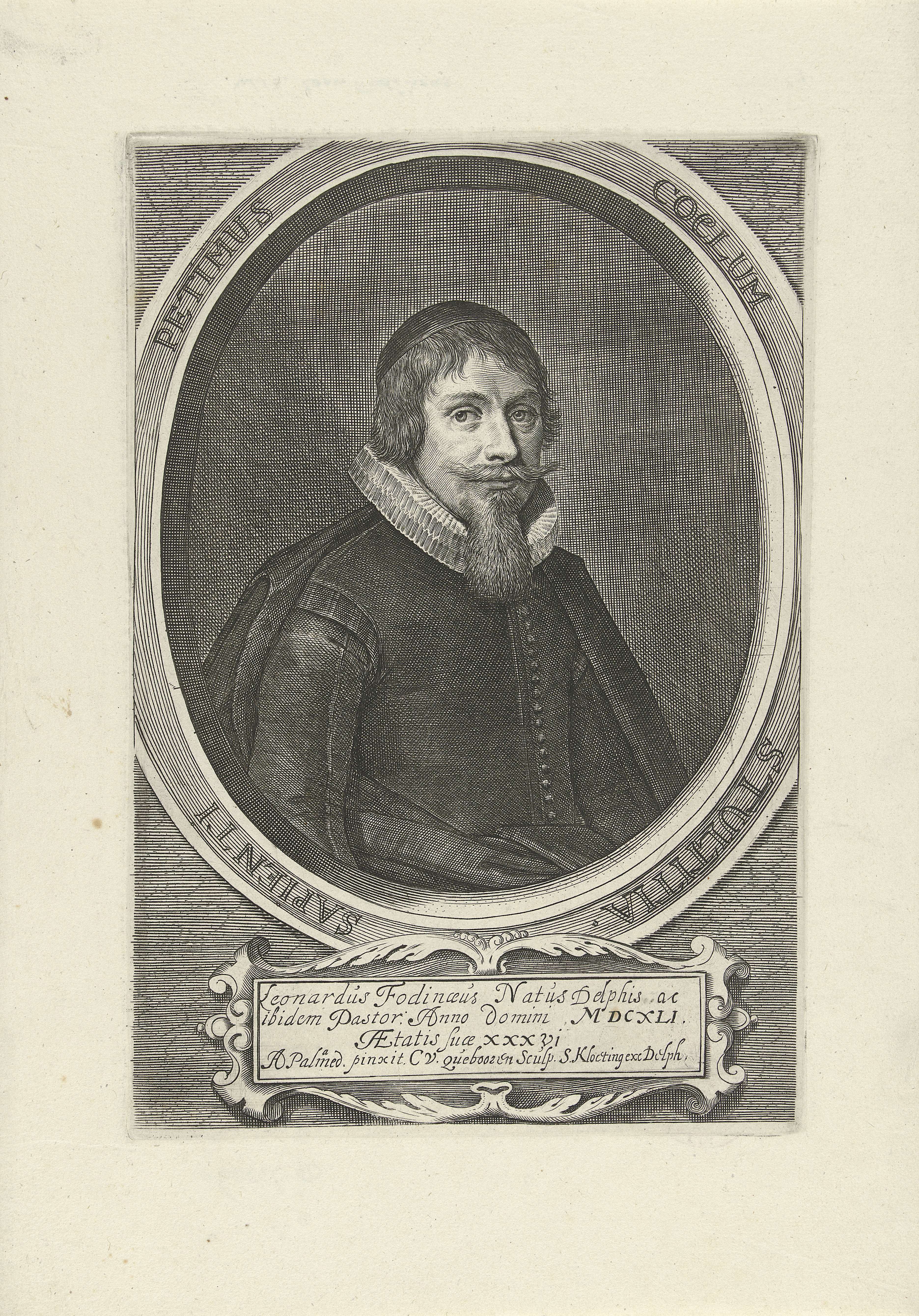 Portret van Leonardus Fodinaeus, predikant te Wormer en Delft. In de omlijsting zijn motto in het Latijn. Onder het portret zijn naam en titels.
