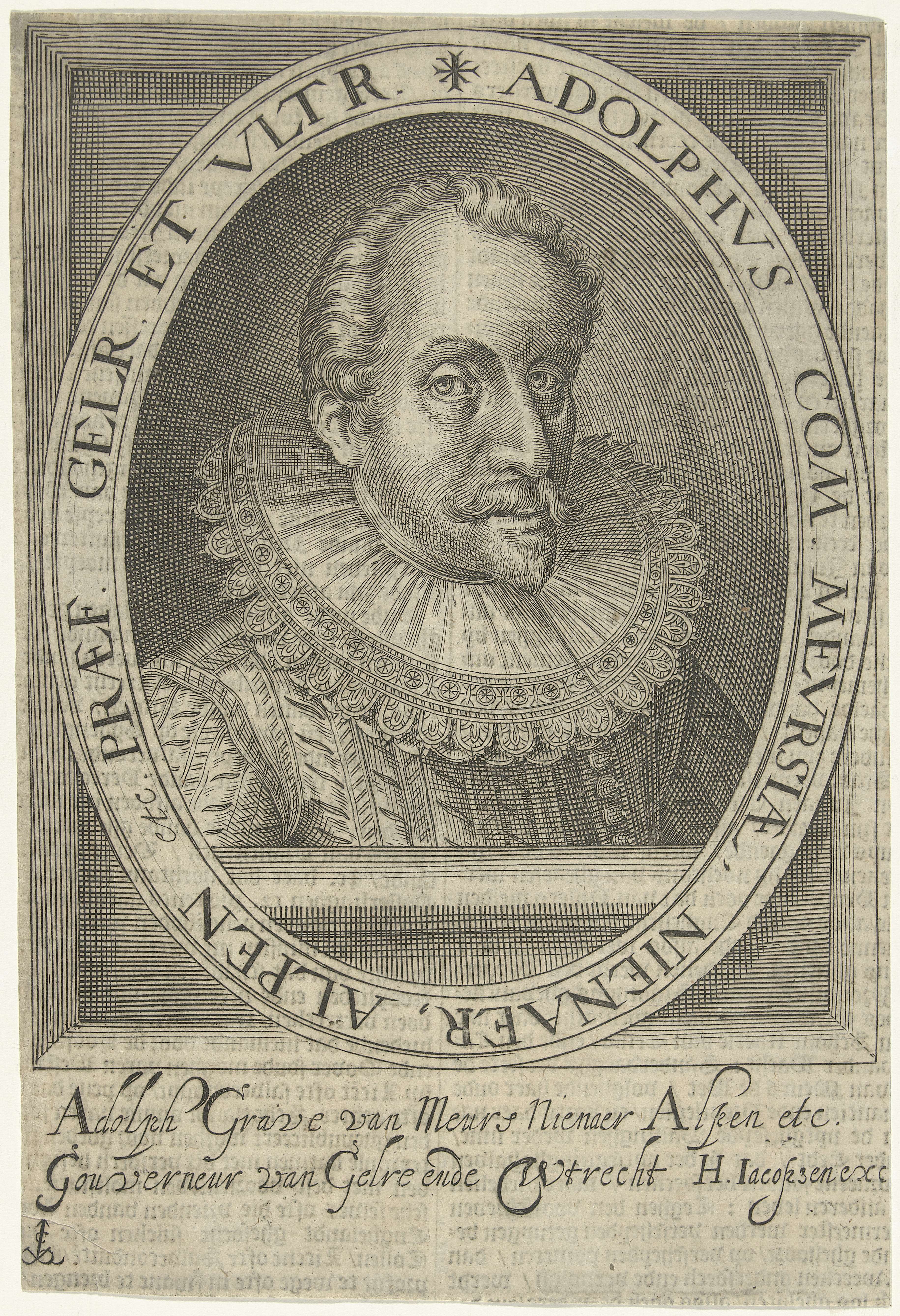 Portret van Adolf van Nieuwenaar, graaf van Nieuwenaar en Meurs. Onder het portret zijn naam en titels.
