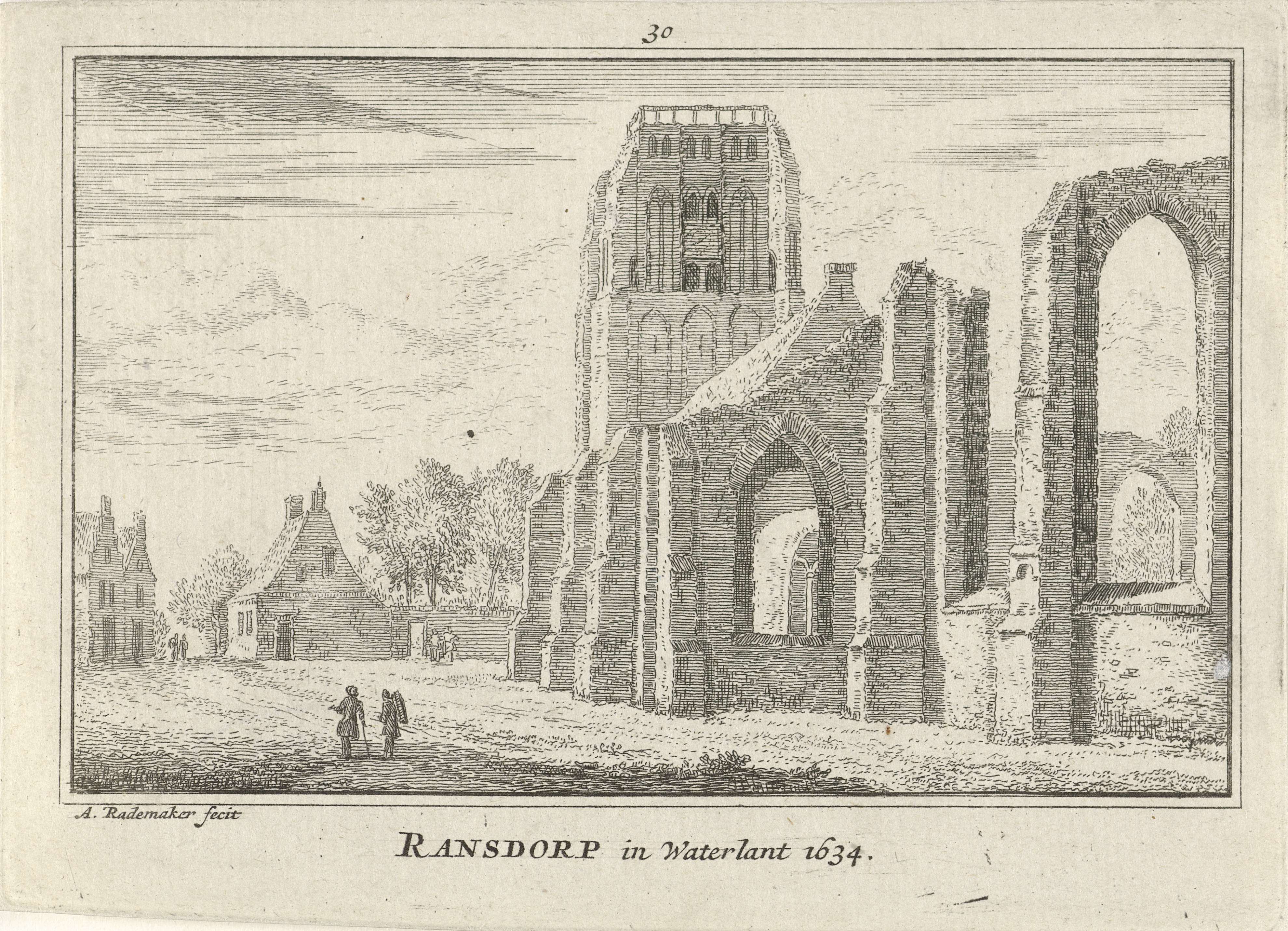 Gezicht op de in 1615 door blikseminslag geruïneerde kerk te Ransdorp, in de situatie omstreeks 1634.