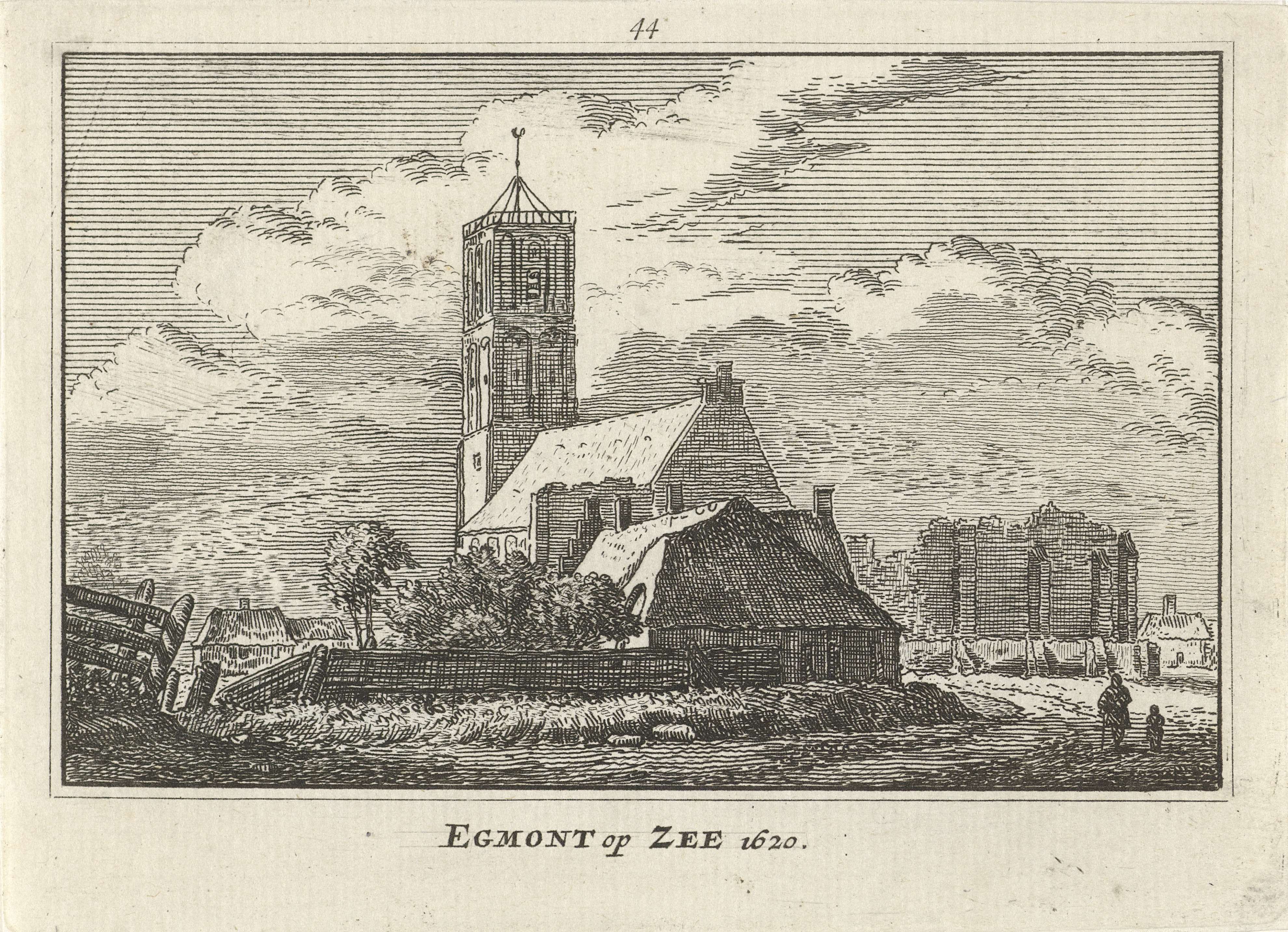 Gezicht op Egmond aan Zee vanuit het zuidoosten, omstreeks 1620. In het midden de kerk met schuin daarvoor een boerenhoeve. Rechts twee figuren en op de achtergrond de koorpartij van de kerk in ruïneuze staat.