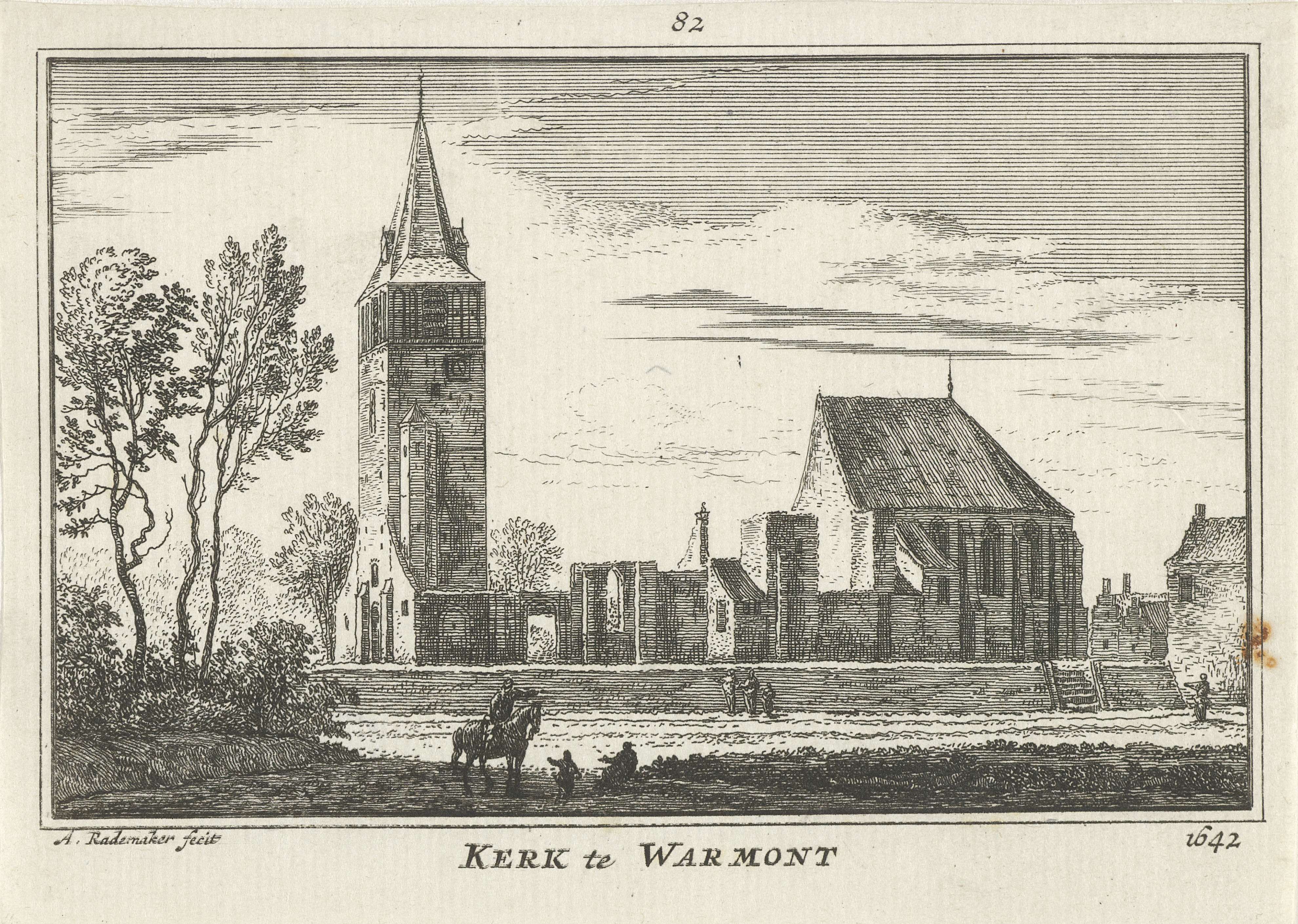 Gezicht op de in 1591 deels verwoeste kerk te Warmond, in de situatie omstreeks 1642. Op de voorgrond enkele figuren, waarvan er een aantal de kerk lijken te bewonderen.
