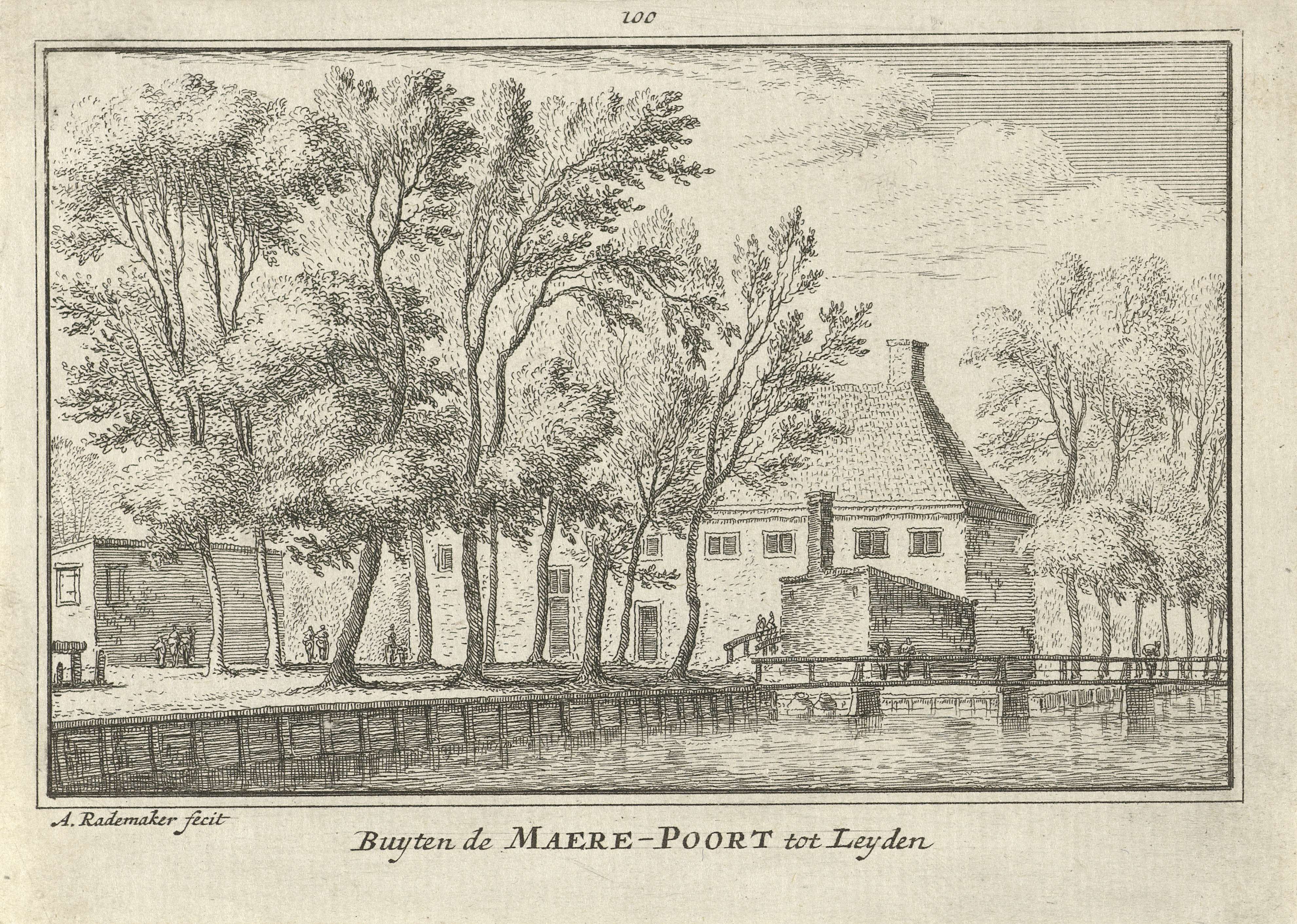 Gezicht op het een gedeelte van de brug voor de Marepoort te Leiden. Er lopen verschillende figuren over de brug. De Marepoort is niet afgebeeld.