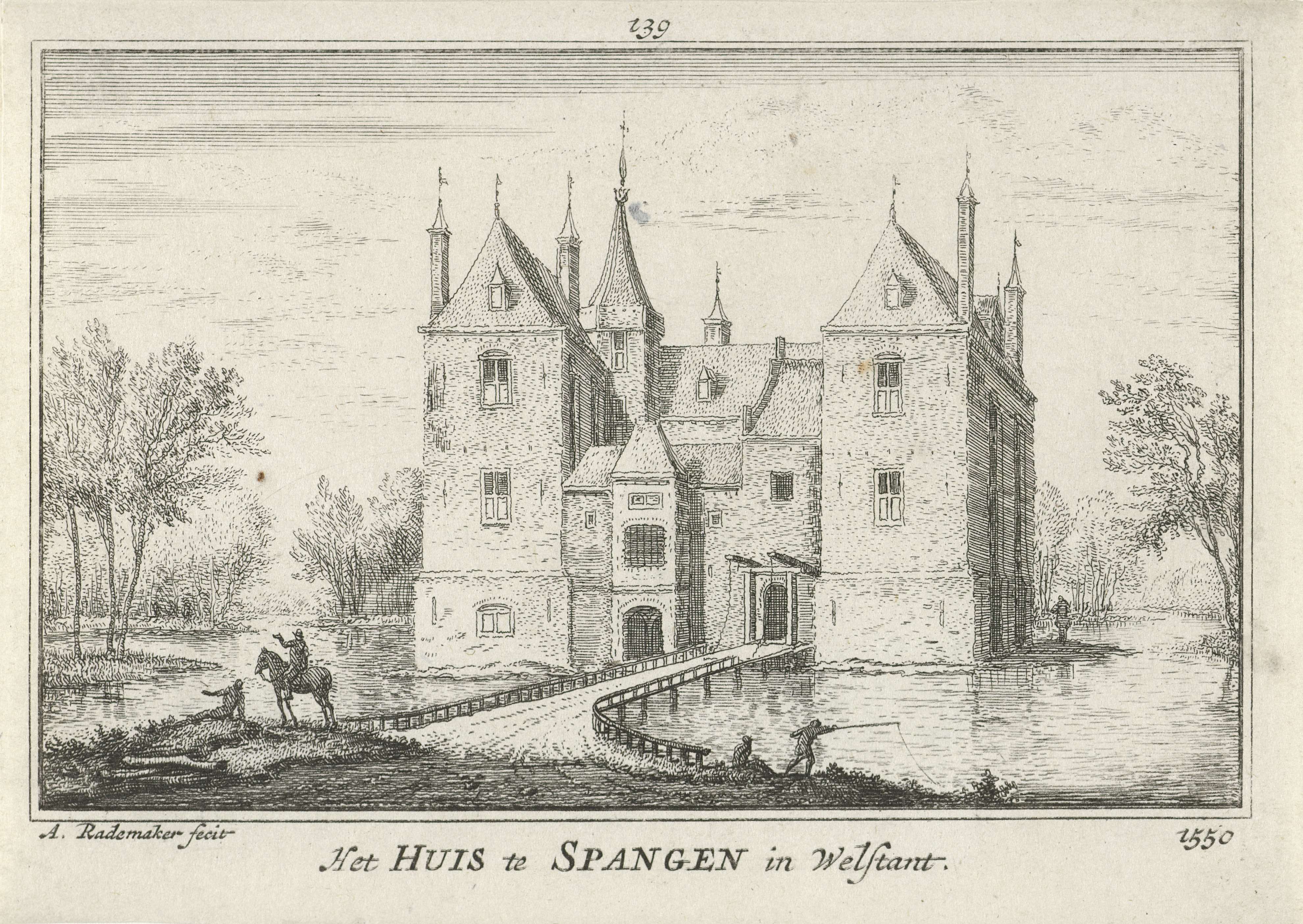 Gezicht op de ingang van Kasteel Spangen en de bijhorende toegangsbrug te Overschie, in de situatie omstreeks 1550 - voordat het tijdens de Tachtigjarige Oorlog zou worden verwoest. Het kasteel werd naar het riviertje de Spangen vernoemd. Op de voorgrond een visser, een ruiter en andere figuren.