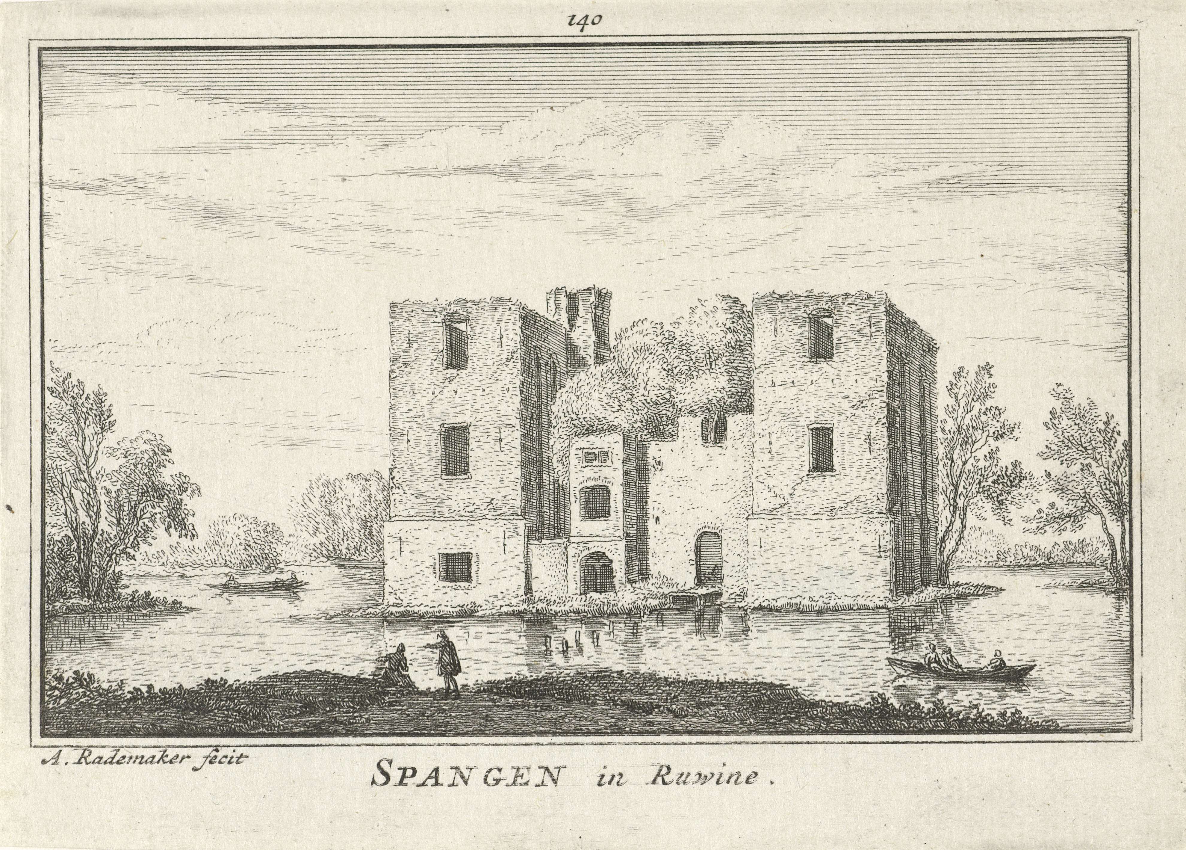 Gezicht op de ruïne van het in 1572 verwoeste Kasteel Spangen, in de situatie omstreeks 1573. Het kasteel werd naar het riviertje de Spangen vernoemd. Op de voorgrond twee figuren en drie figuren in een roeiboot.