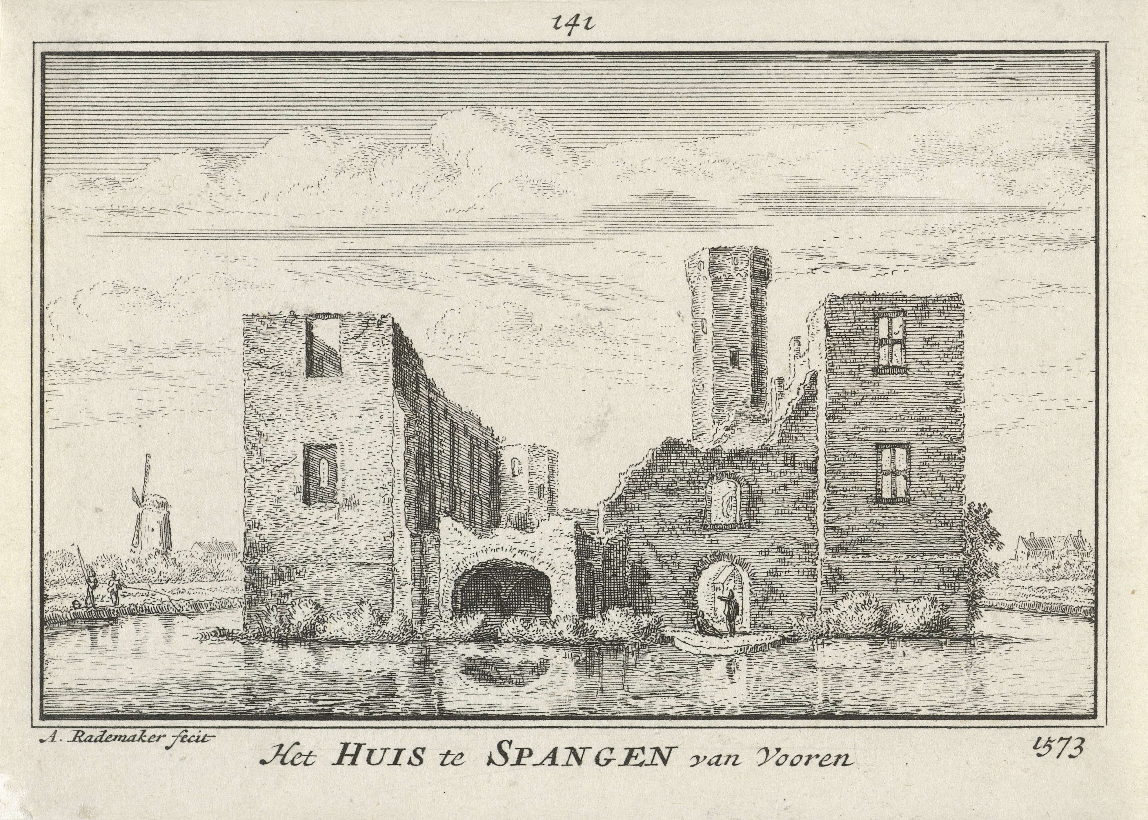 Gezicht op de voorkant van de ruïne van het in 1572 verwoeste Kasteel Spangen, in de situatie omstreeks 1573. Het kasteel werd naar het riviertje de Spangen vernoemd. Links een molen en twee vissers en op de voorgrond een roeiboot met twee figuren.