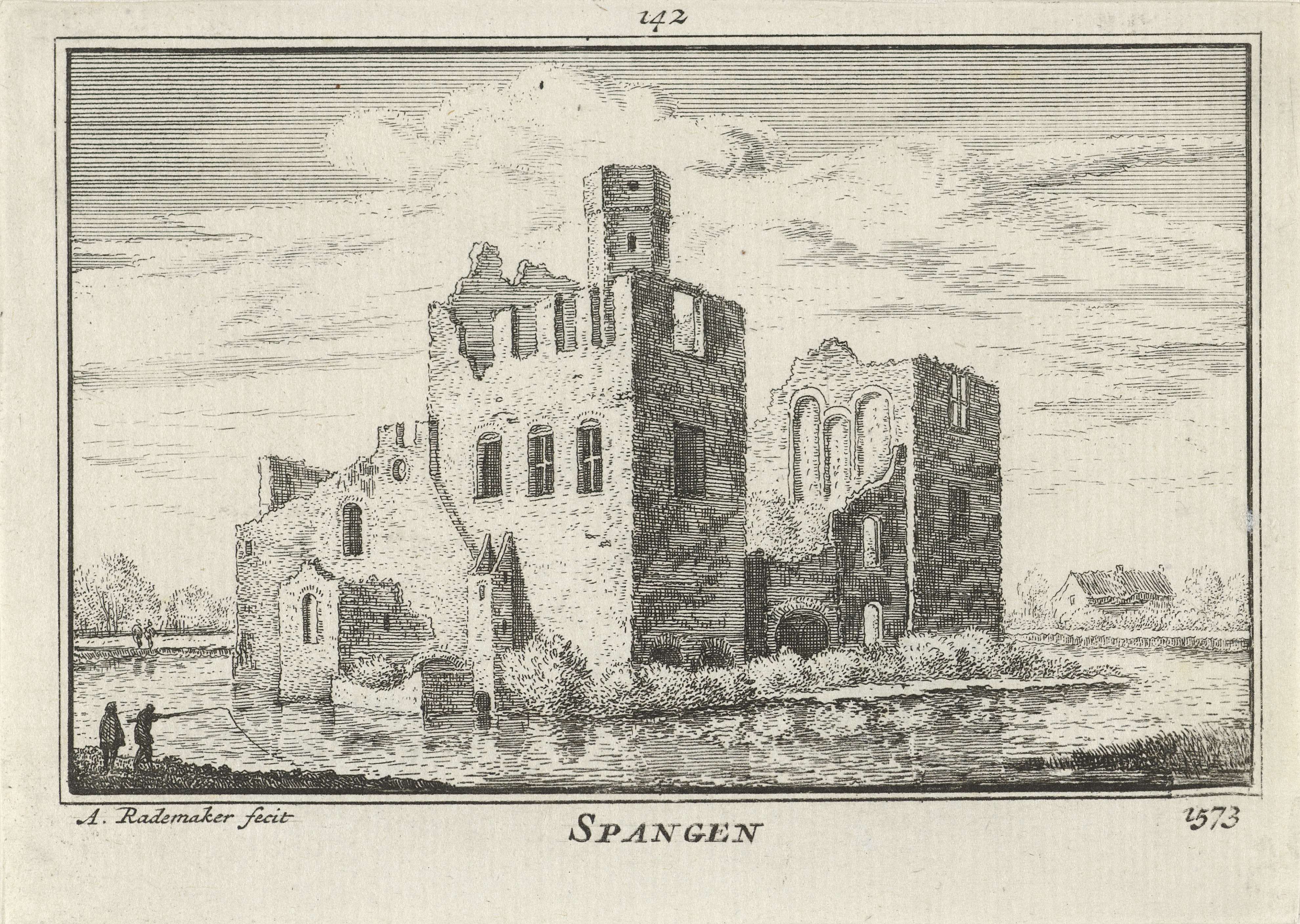 Gezicht op de ruïne van het in 1572 verwoeste Kasteel Spangen, in de situatie omstreeks 1573. Het kasteel werd naar het riviertje de Spangen vernoemd. Op de voorgrond een figuur en een hengelaar.