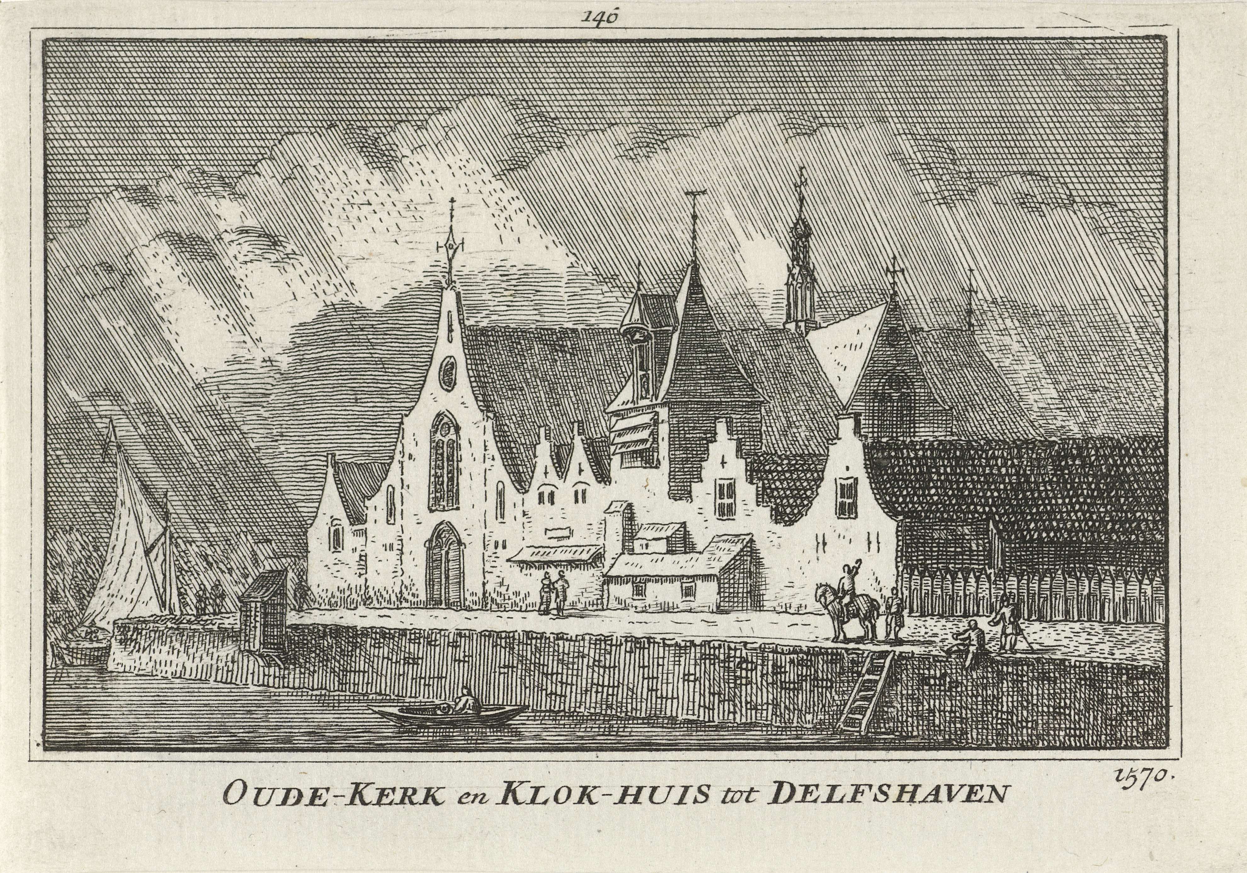 Gezicht op de voorkant van de Oude of Pelgrimvaderskerk en de houten klokkentoren aan de Aelbrechtskolk te Delfshaven, in de situatie omstreeks 1570. Op de voorgrond een roeiboot, ruiter en enkele figuren.