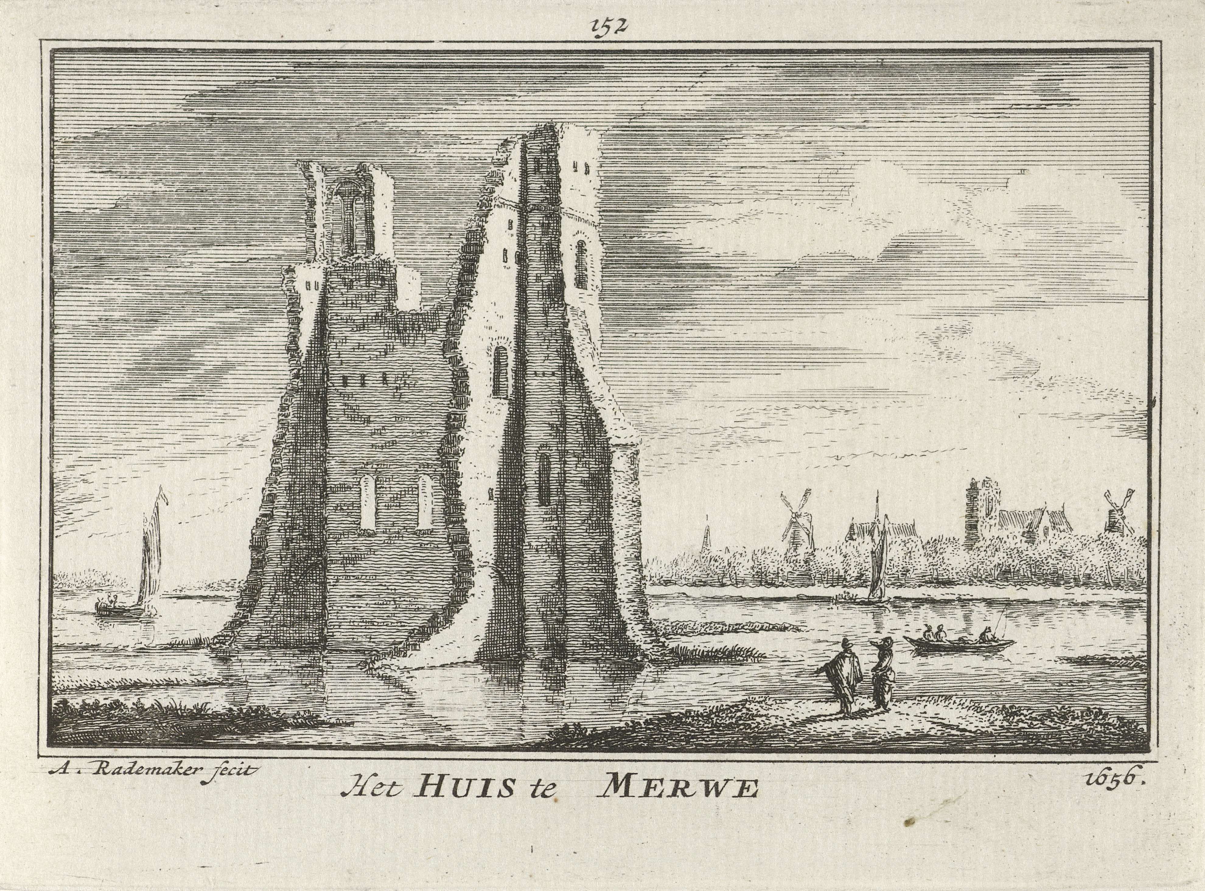 Gezicht op de ruïne van Huis te Merwede aan de rivier de Merwede, in de situatie omstreeks 1656. Op de voorgrond enkele figuren en op de achtergrond verschillende boten en de contouren van Dordrecht.