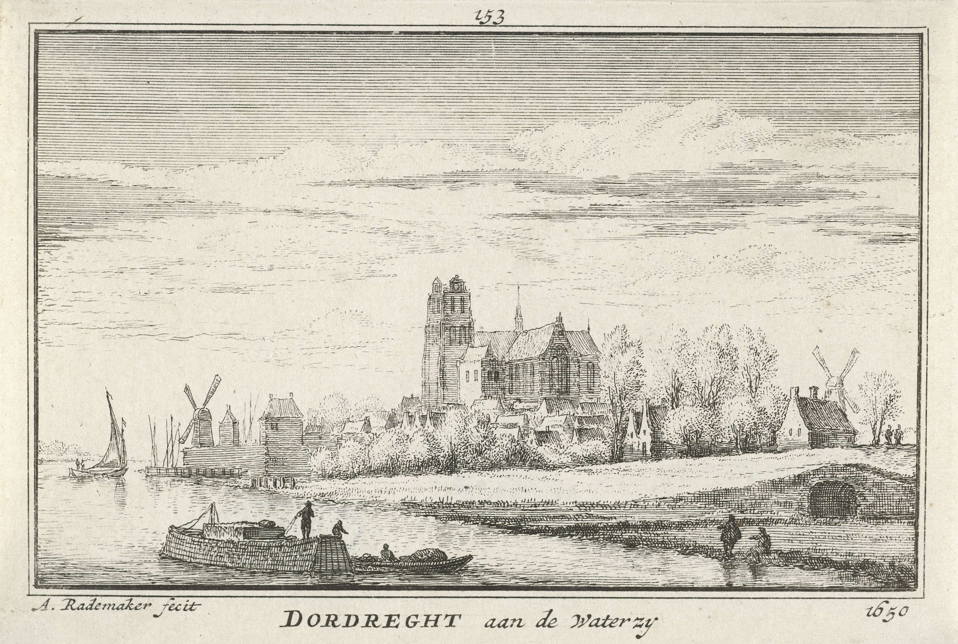 Gezicht op Dordrecht aan de rivier de Merwede, in de situatie omstreeks 1650. Op de voorgrond enkele figuren en boten en op de achtergrond de Grote Kerk en een aantal molens en huizen.