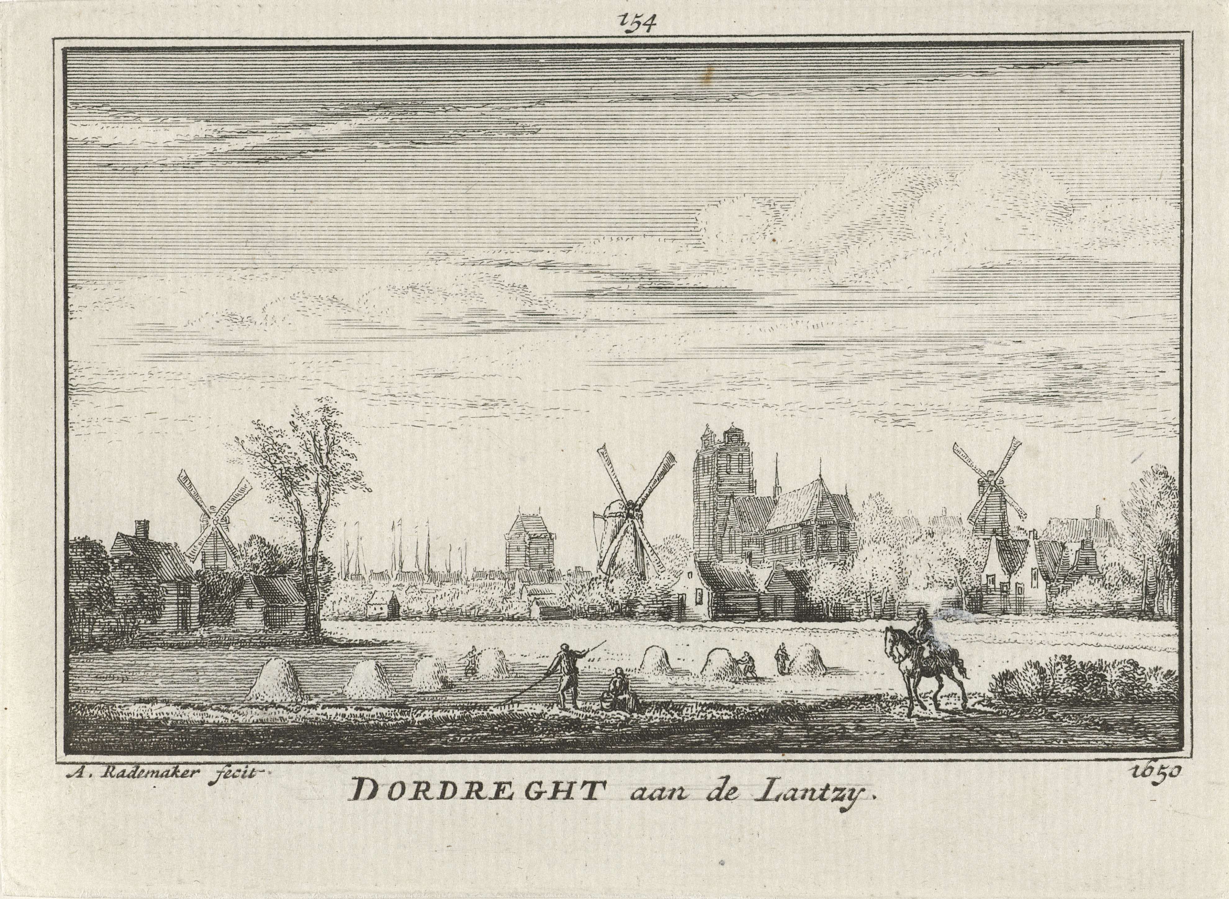 Gezicht op Dordrecht, gezien vanaf het land in de situatie omstreeks 1650. Op de voorgrond werkende boeren op een akker met hooistapels en een ruiter. Op de achtergrond de Grote Kerk en een aantal molens en huizen.