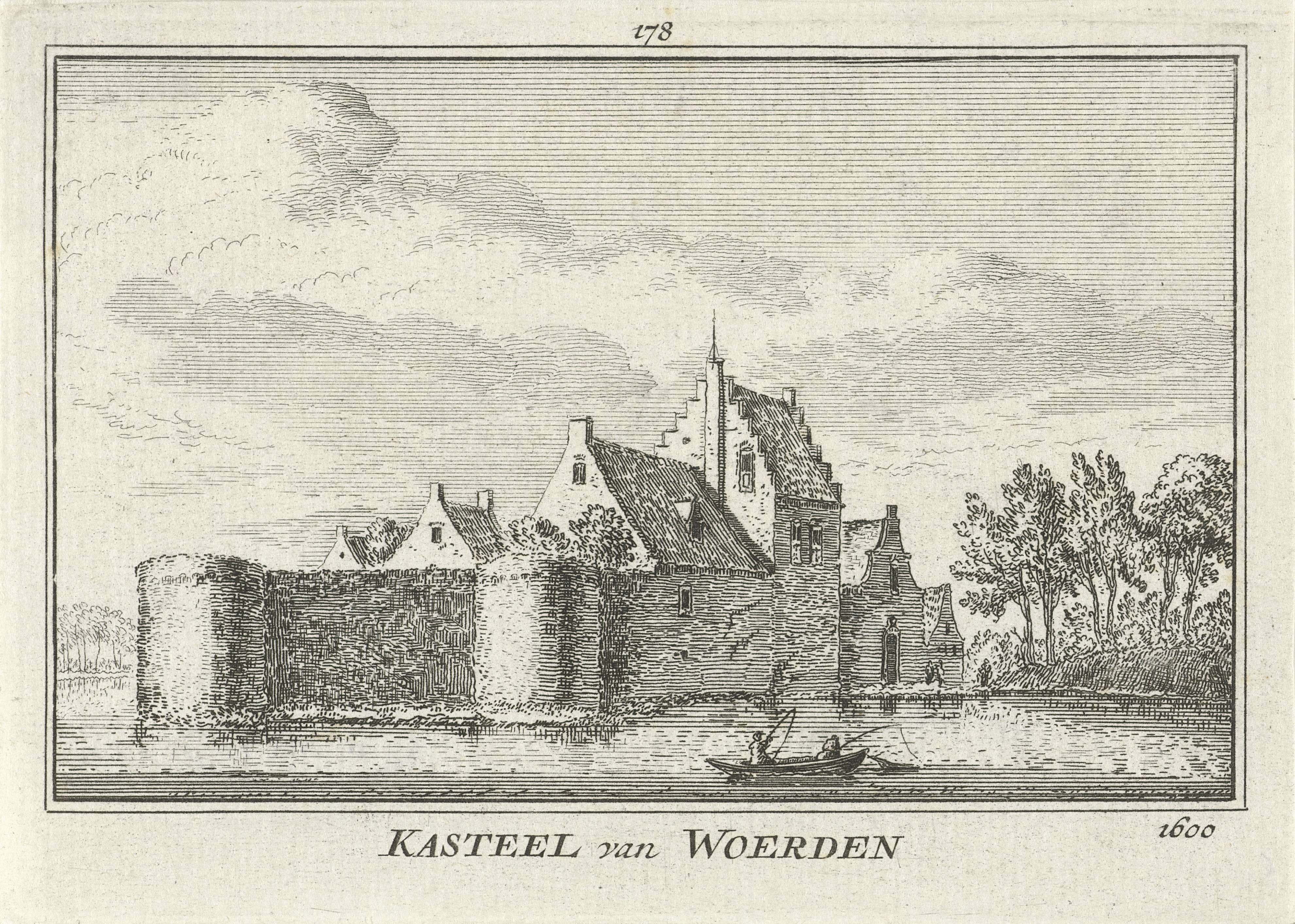 Gezicht op de voorzijde en rechter zijkant van Slot Woerden, ook wel Kasteel van Woerden genoemd, in de situatie omstreeks 1600. Op de slotgracht twee vissers in een roeiboot.