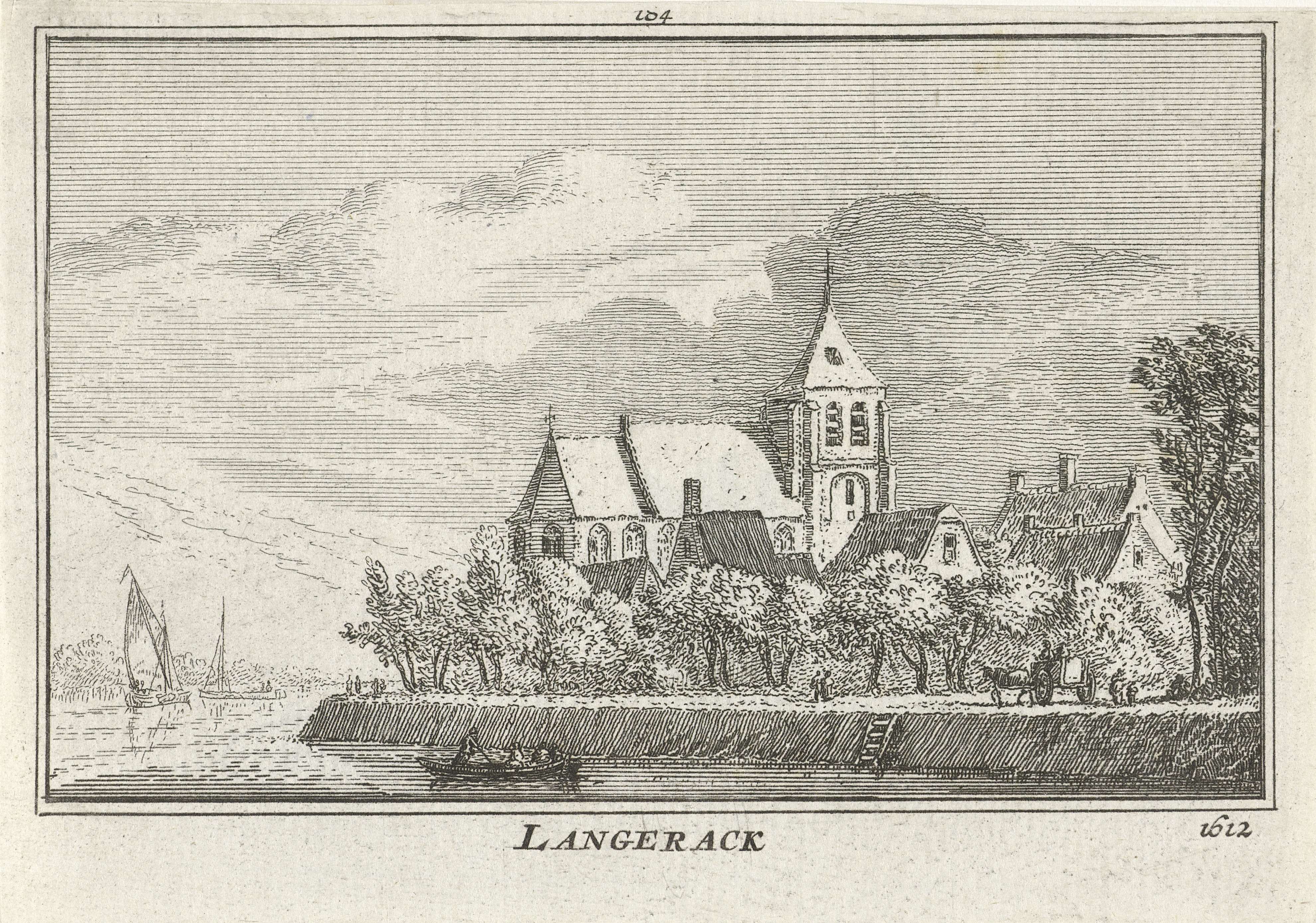 Gezicht op het dorp Langerak en de dorpskerk, in de situatie omstreeks 1612. Op de rivier de Lek enkele boten en langs de waterkant rijdt een wagen.