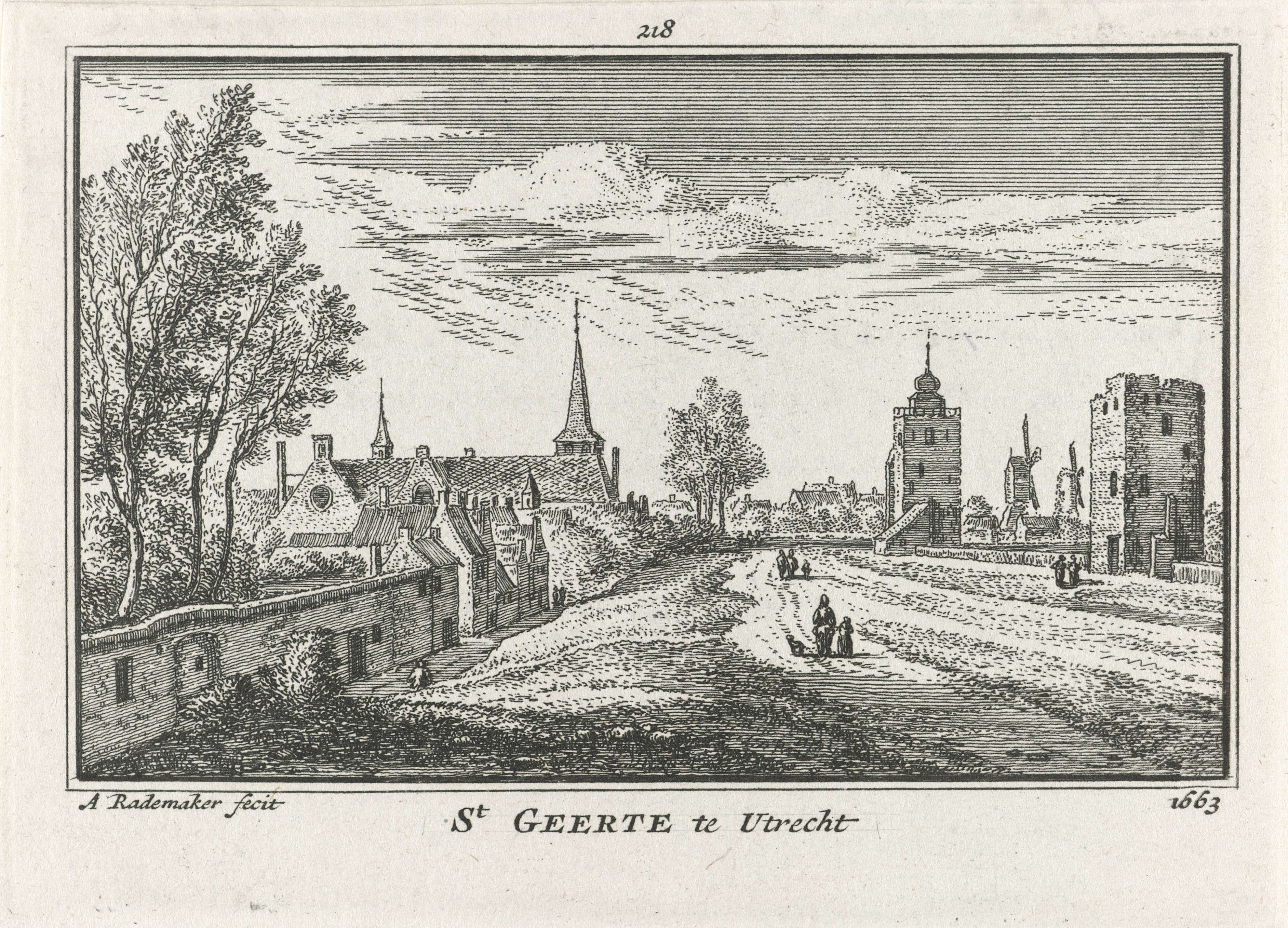 Gezicht op Utrecht met links de stadsmuur en op de achtergrond de Smeetoren en de torens van de Geertekerk en de Mariakerk, in de situatie omstreeks 1663.