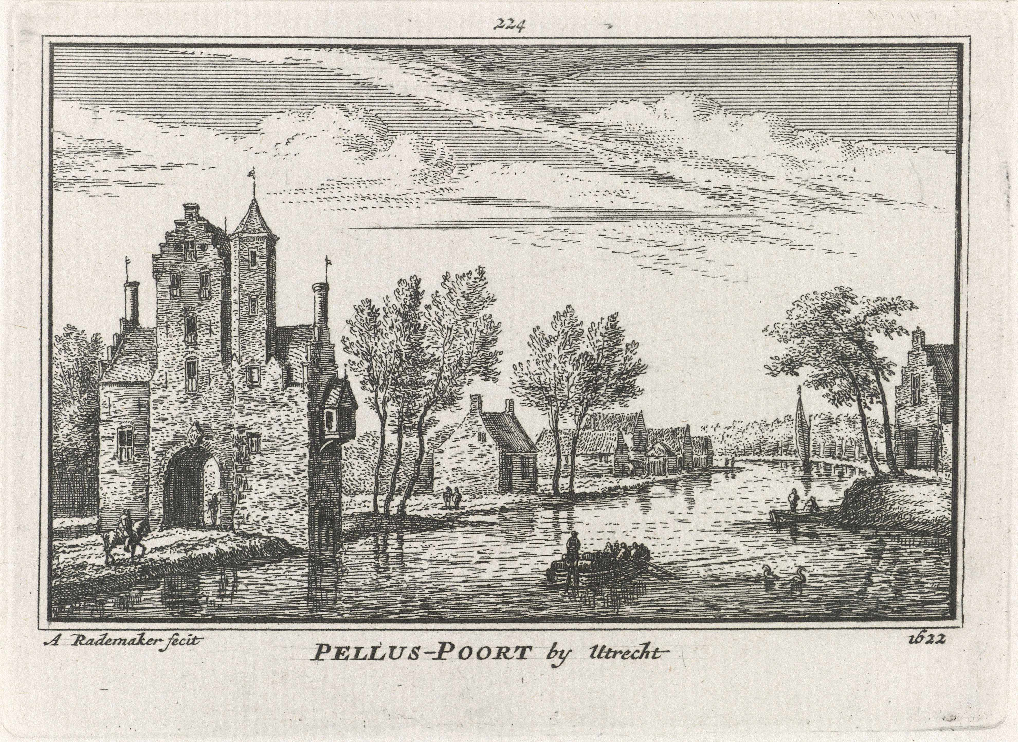 Gezicht over de rivier de Vecht op de Pellecussenpoort buiten Utrecht in de richting van de stad, in de situatie omstreeks 1622. Op de Vecht varen verschillende boten en bij de poort rijdt een ruiter.