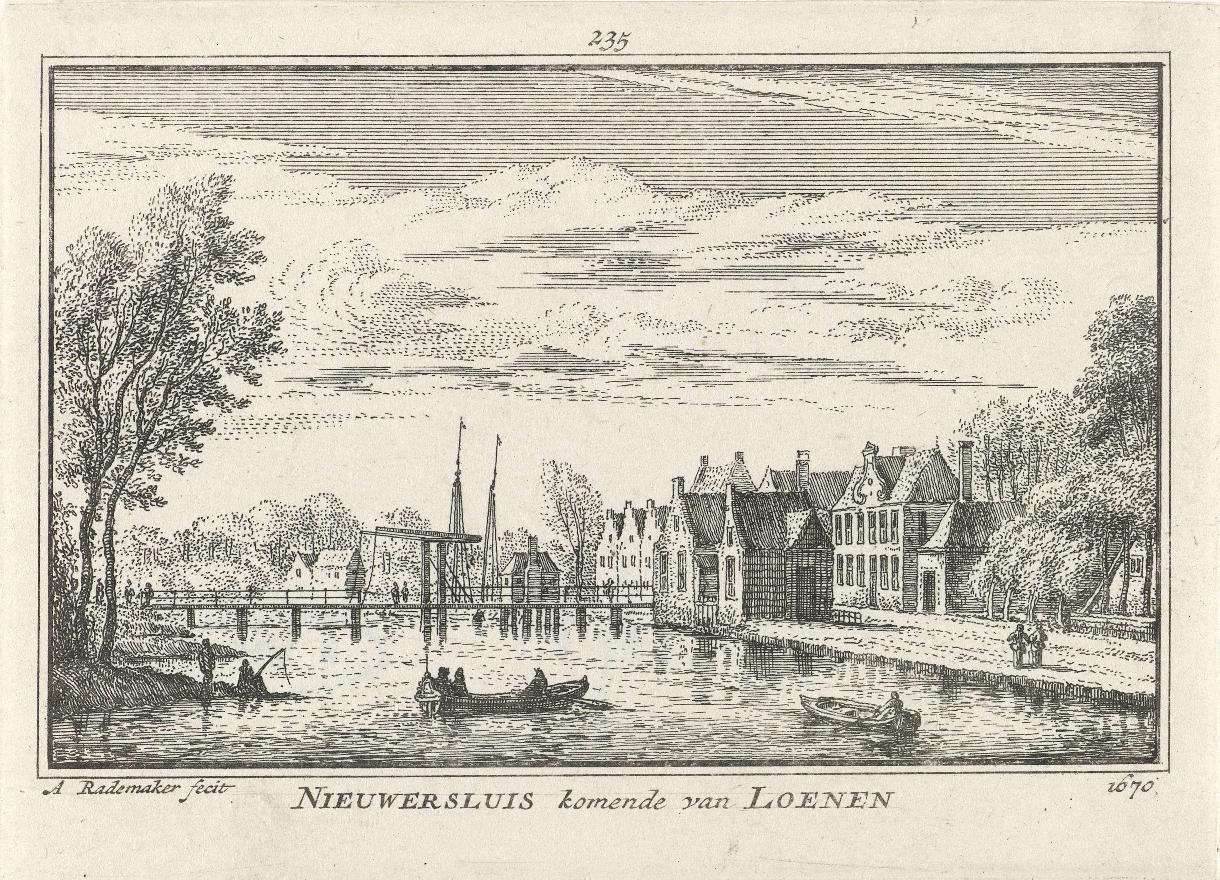Gezicht op het dorp Nieuwersluis met op de achtergrond de ophaalbrug, in de situatie omstreeks 1670. Op de voorgrond twee boten met figuren.