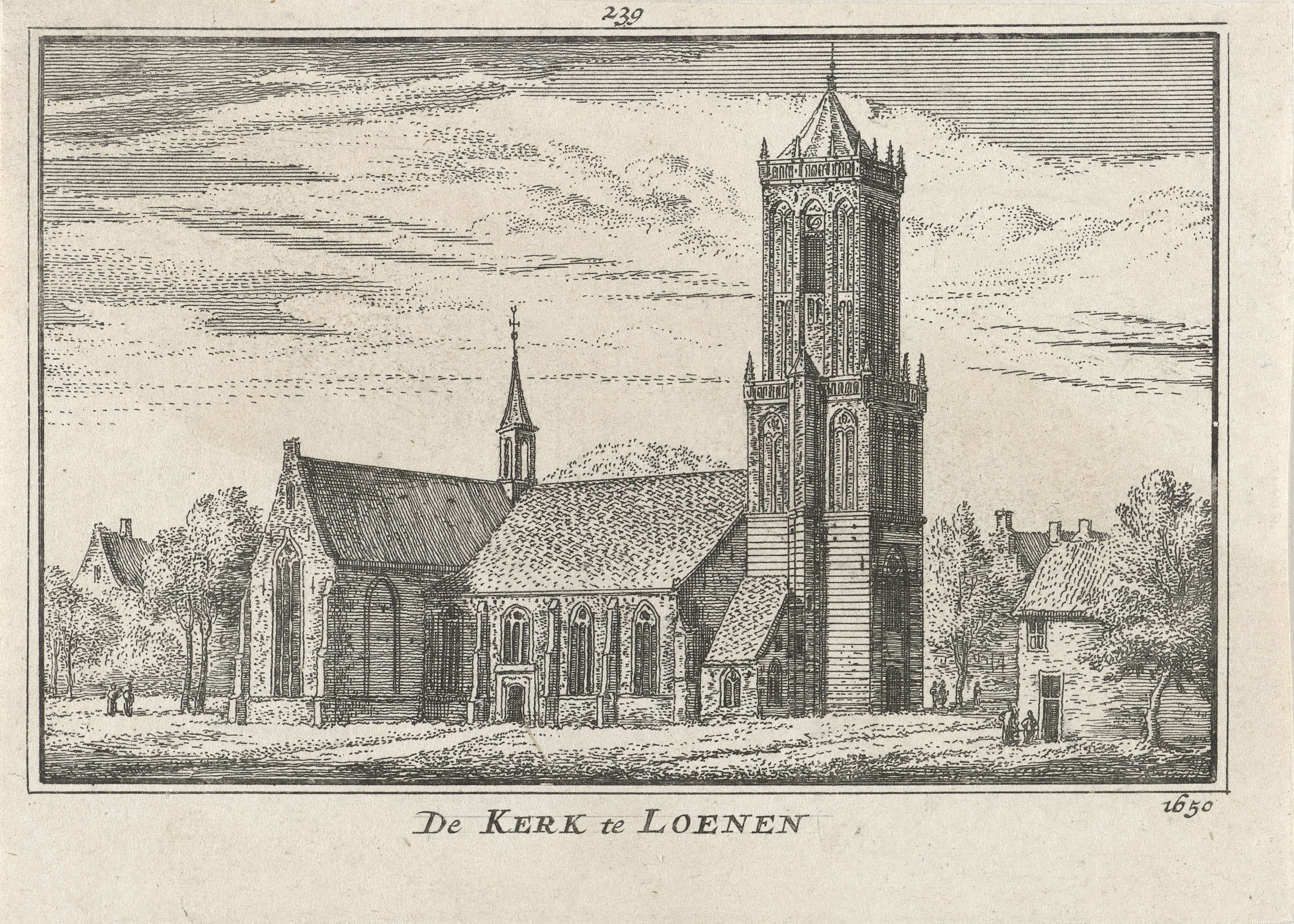 Gezicht op de kerk te Loenen aan de rivier de Vecht, in de situatie omstreeks 1650.