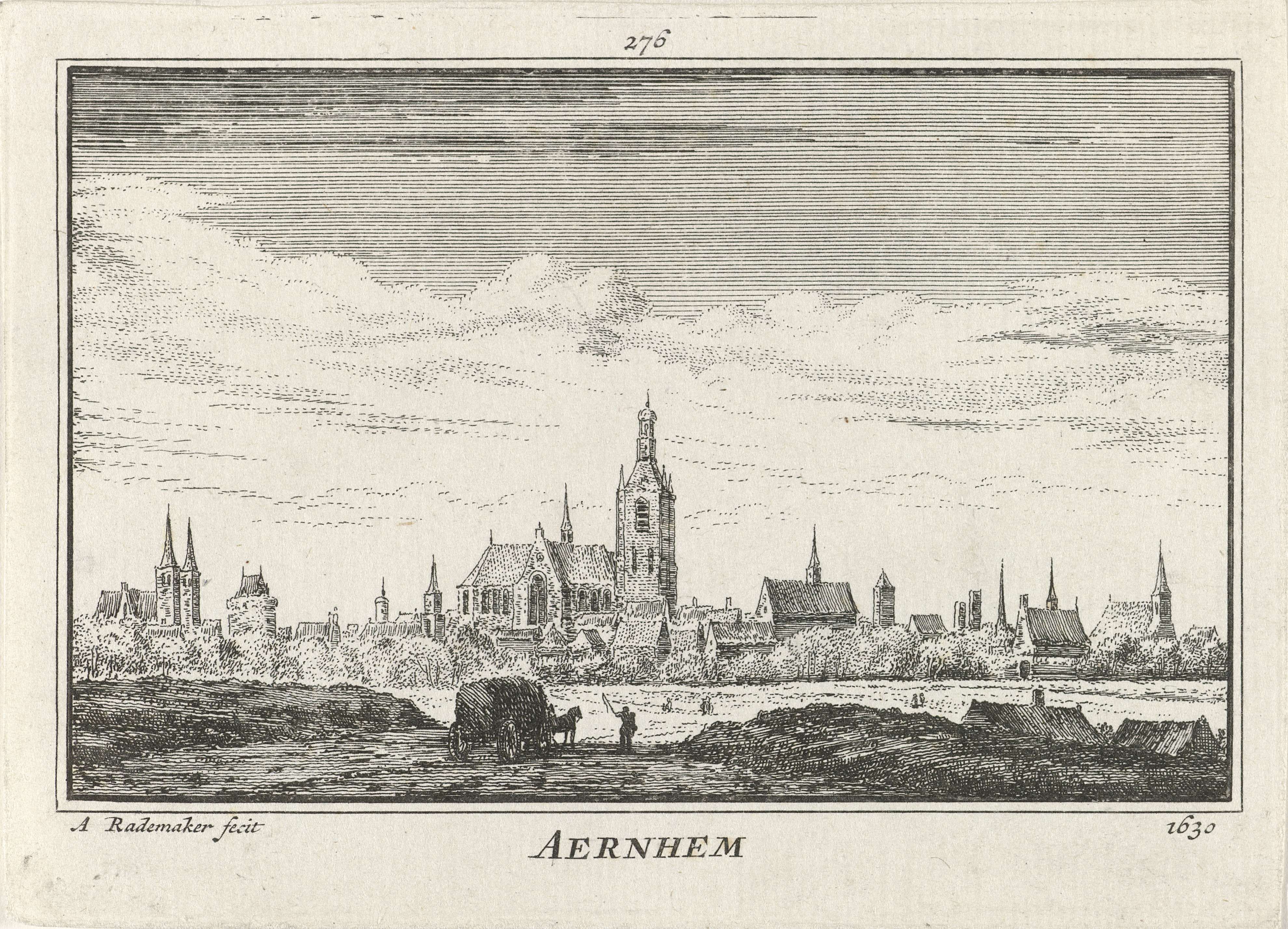 Gezicht op de stad Arnhem met links de Walburgiskerk en in het midden de Eusebiuskerk, in de situatie omstreeks 1630. Op de voorgrond een akkerlandschap met een hooikar.