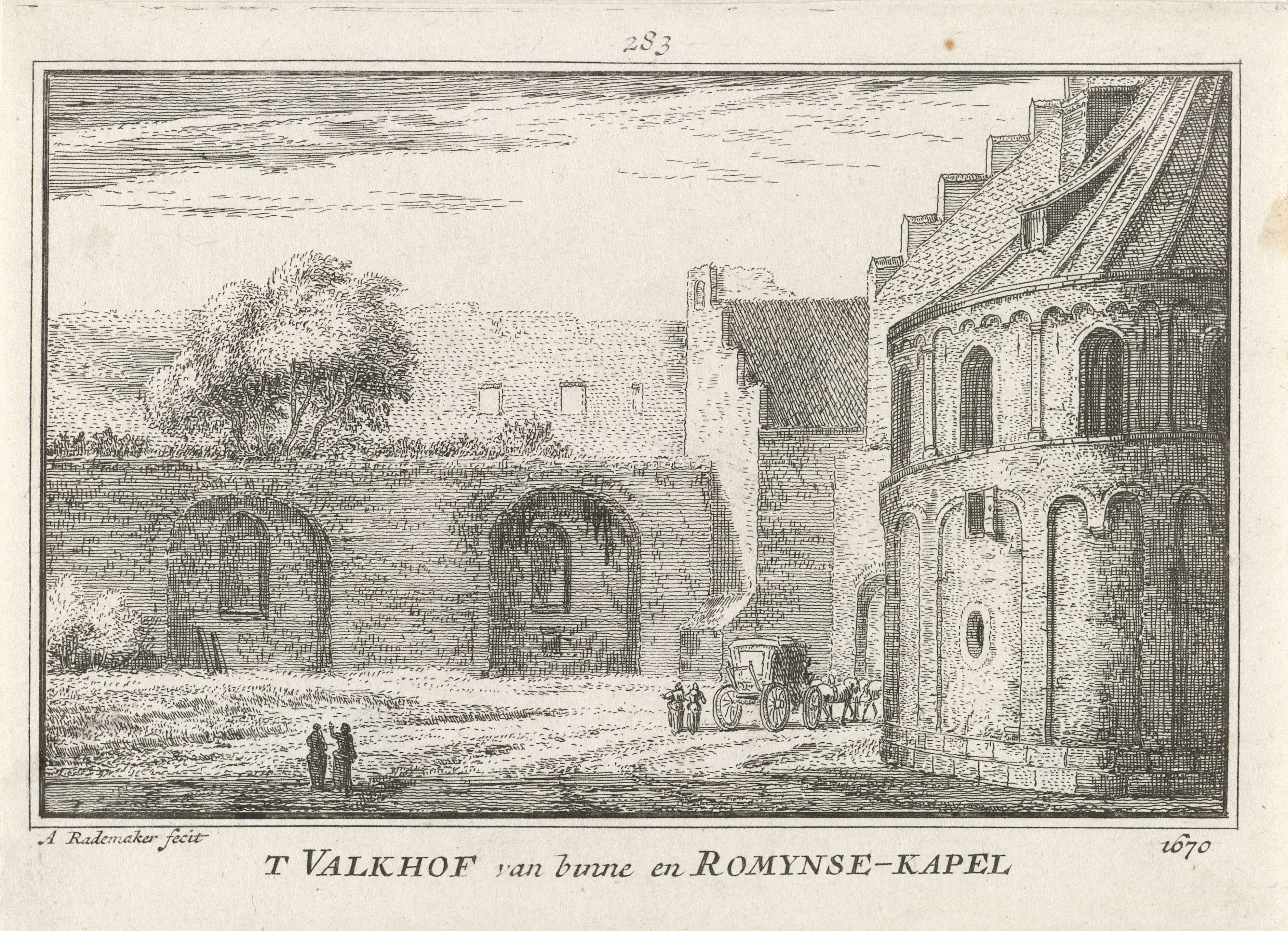 Gezicht op de Sint Maartenskapel, ook wel de Barbarossa-ruïne genoemd, van het Valkhof te Nijmegen, in de situatie omstreeks 1670.